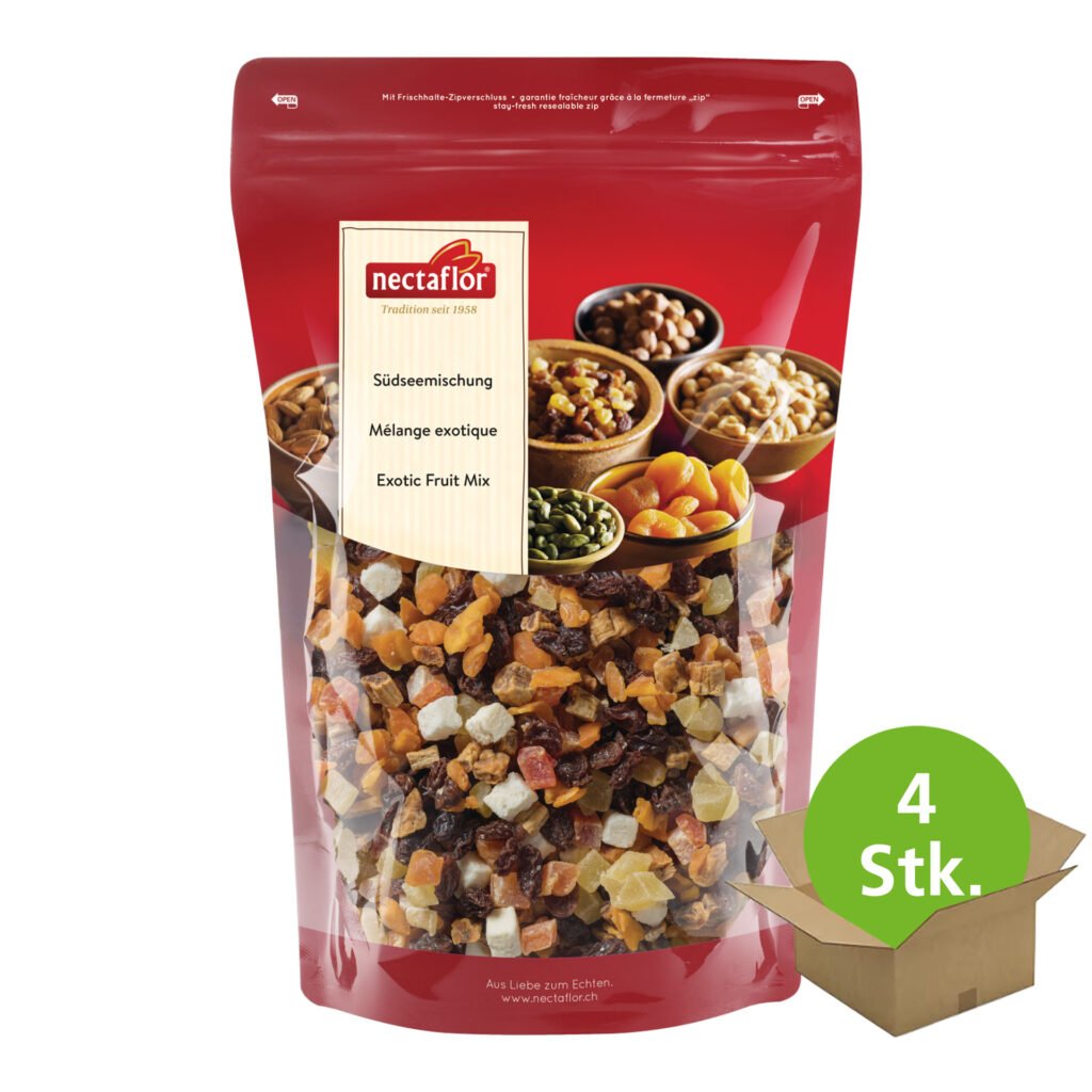 Karibik Feeling pur – diese Südseemischung aus Kokosnuss, Mango, Banane, Ananas, Sultaninen und Papaya verführt mit einem Hauch Exotik. Karibik-Feeling pur – in dieser nectaflor Südseemischung treffen köstlich süsse Ananas-, Papaya-, Mango- und Bananen-Stückchen auf aromatischen Kokosnuss und vollfruchtige Sultaninen. Diese exotische Trockenfrucht Mischung steckt voller Energie und Ballaststoffe und erinnert an die Sommer, Sonne, Meer und Palmen.