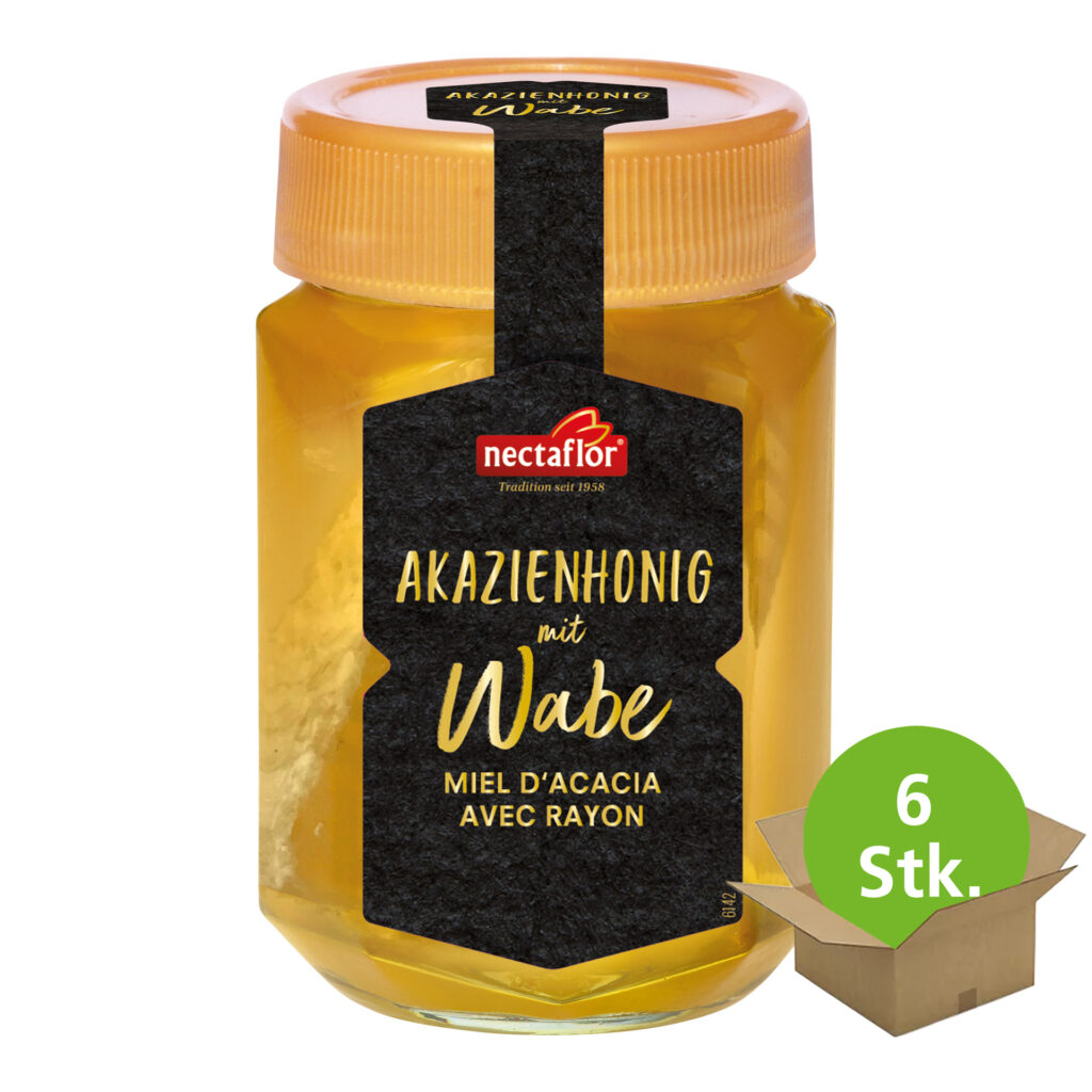 Genuss für Honigliebhaber in seiner reinsten, naturbelassensten Form: köstlich-milder Akazienhonig mit Wabenstück. Eine wahre Rarität für Kenner. Ungarn ist das Land der weiten, unberührten Akazienwälder und -haine. Ihre duftende, weisse Blütenpracht bietet im Frühling Tausenden von Bienen eine Fülle an wertvollem Nektar. Daraus entsteht der helle Akazienhonig mit seinem typischen, süsslich-milden Geschmack. Eine ganz besondere Köstlichkeit in ihrer ursprünglichsten, reinsten Form ist unser nectaflor Akazienhonig mit Wabenstück – direkt aus dem Bienenstock. Das Wabenstück beinhaltet all seine gesundheitlich wertvollen Wirkstoffe und ätherischen Öle. Liebhaber und Kenner kauen die mild-aromatische Honigwabe mitsamt Bienenwachs pur und verzehren ihn mit.