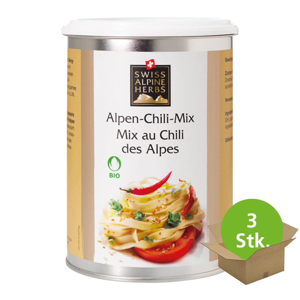Unser Bio Alpen Chili Mix in der Nachfülldose ist eine Kräutersalz Mischung mit Meersalz und Cayennepfeffer. Der feurig-scharfe Mix wird mit aromatischen Kräutern abgerundet. Der Swiss Alpine Herbs Bio Alpen Chili Mix in der Nachfülldose ist eine feurig-rassige Kräutermischung. Er besteht aus Bio Cayennepfeffer (Alpen Chili) aus dem Schweizer Alpenraum und verschiedenen Kräutern und Gemüse wie Oregano, Zwiebeln, Fenchelsamen und anderen.