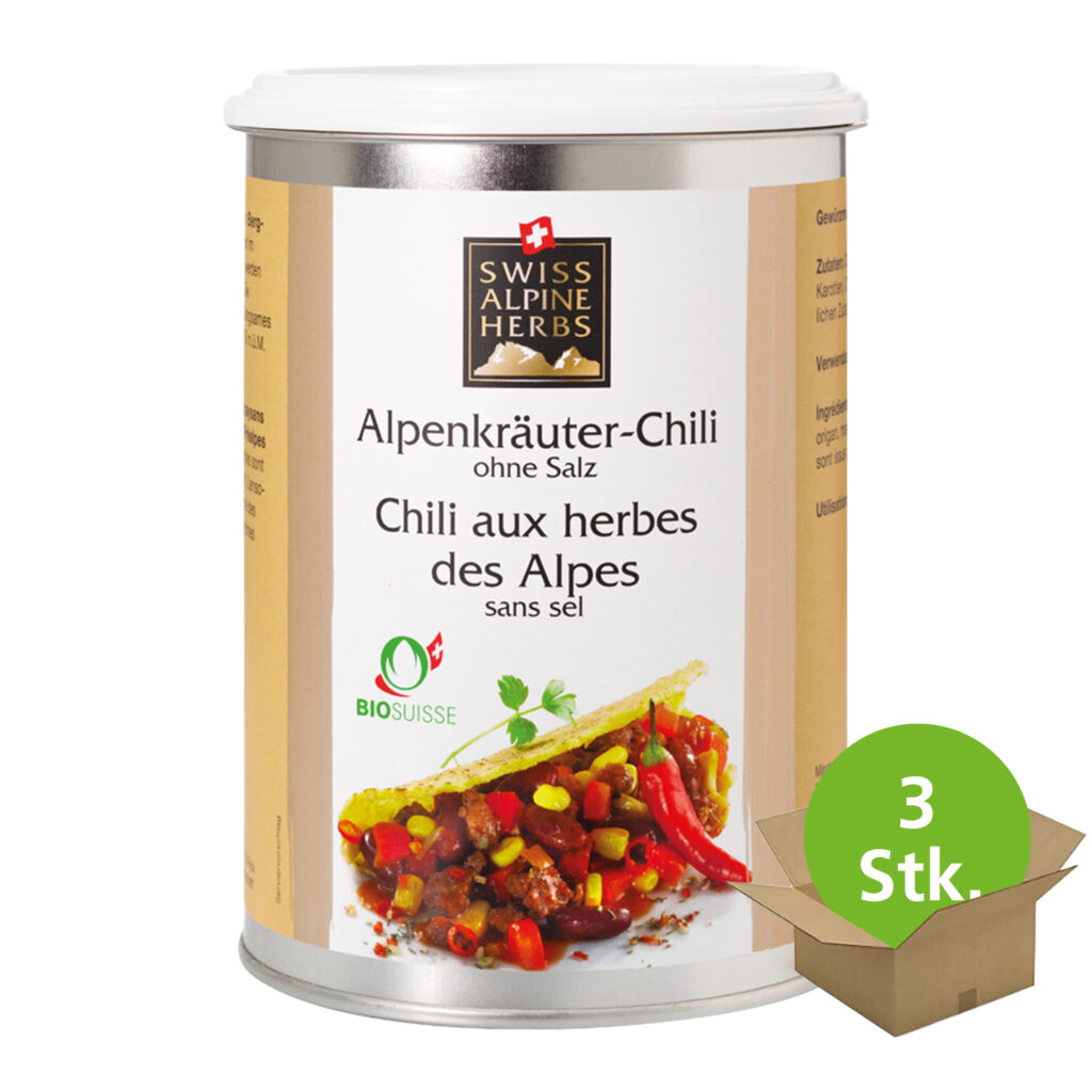 Feurig-rassige Bio Kräutermischung mit Cayennepfeffer (Alpen Chili) abgerundet mit aromatischen Kräutern. OHNE SALZ Würzen ohne Salz: Swiss Alpine Herbs Bio Alpenkräuter Chili in der Mühle ist eine feurig-rassige Kräutermischung OHNE SALZ aus Bio Cayennepfeffer (Alpen Chili) aus dem Schweizer Alpenraum und verschiedenen Kräutern und Gemüsen wie Thymian, Zwiebeln, Knoblauch, Oregano, Paprika, Karotten und anderen.
