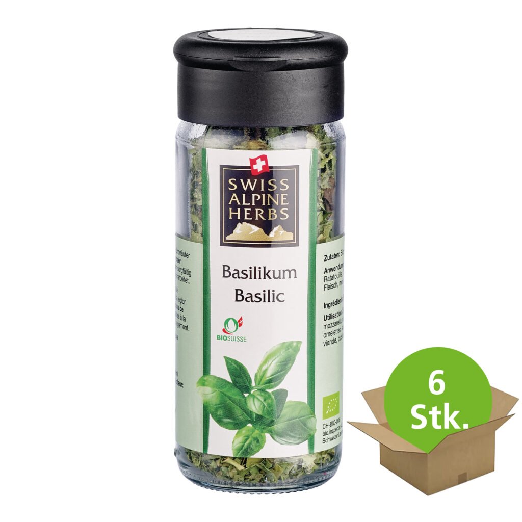 Bio Basilikum mit frischem, pfeffrig-aromatisch leicht scharfem Geschmack. Ideal für die italienische Küche. Basilikum (ocimum basilicum), auch Basilienkraut oder Königskraut genannt ist eine Pflanzenart aus aus der Familie der Lippenblütler. Die wunderbar duftende, sonnenverwöhnte Gewürzpflanze ist aus unseren Kräutergärten nicht mehr wegzudenken. Frische oder auch getrocknete Basilikumblätter werden besonders in der italienischen und der französischen Küche verwendet und verleihen den Gerichten eine einmalige Basilikumnote mit frischem, pfeffrig-aromatischen Geschmack. Getrockneter Basilikum ist nicht mehr so aromaintensiv wie frischer. Swiss Alpine Herbs Bio Basilikum wird von Bergbauern im Schweizer Alpen- und Voralpenraum angebaut und von Hand gepflegt. Um möglichst viel Aroma beizubehalten, werden die zarten Basilikumblätter erst kurz bevor die Pflanze erblüht, geerntet. Denn dann enthalten sie am meisten ätherische Öle und haben ihr maximales Aroma erreicht.