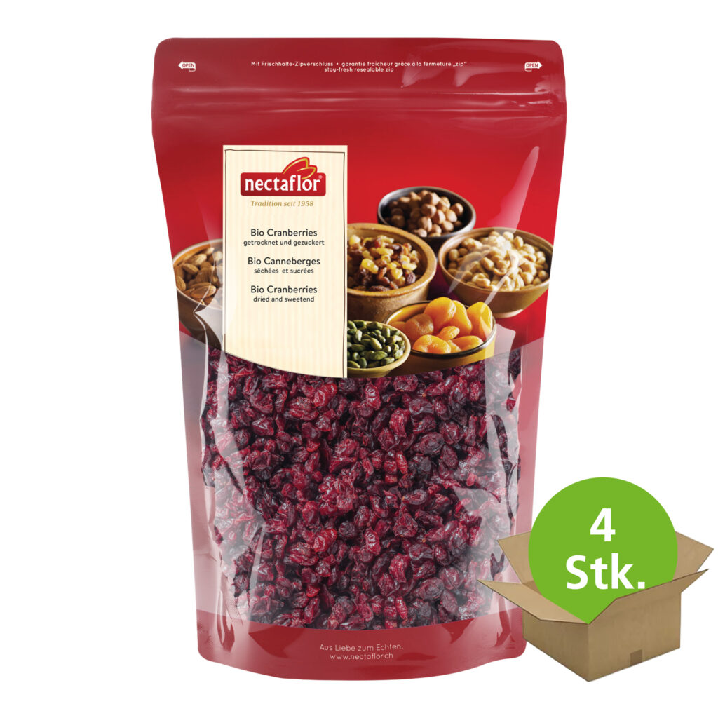 Die schön roten Bio Cranberries schmecken herb-säuerlich und sind ein wahres Superfood mit hohem gesundheitlichem Wert. Bio Cranberries sind gesund und erfreuen sich auch hierzulande zunehmender Beliebtheit. Die schön rote Beere aus Kanada ist fettarm, reich an wertvollen Ballast- und Mineralstoffen, Vitaminen und Antioxydantien und gehört dank ihrem hohen gesundheitlichen Wert zu den sogenannten Superfood. nectaflor Cranberries schmecken herb-säuerlich und verleihen Speisen und Dessert jeder Art eine spezielle Note. Nach der Ernte werden die Beeren sorgfältig getrocknet, geschnitten und leicht gezuckert, so behalten sie einen angenehm fleischigen, weichen Biss.