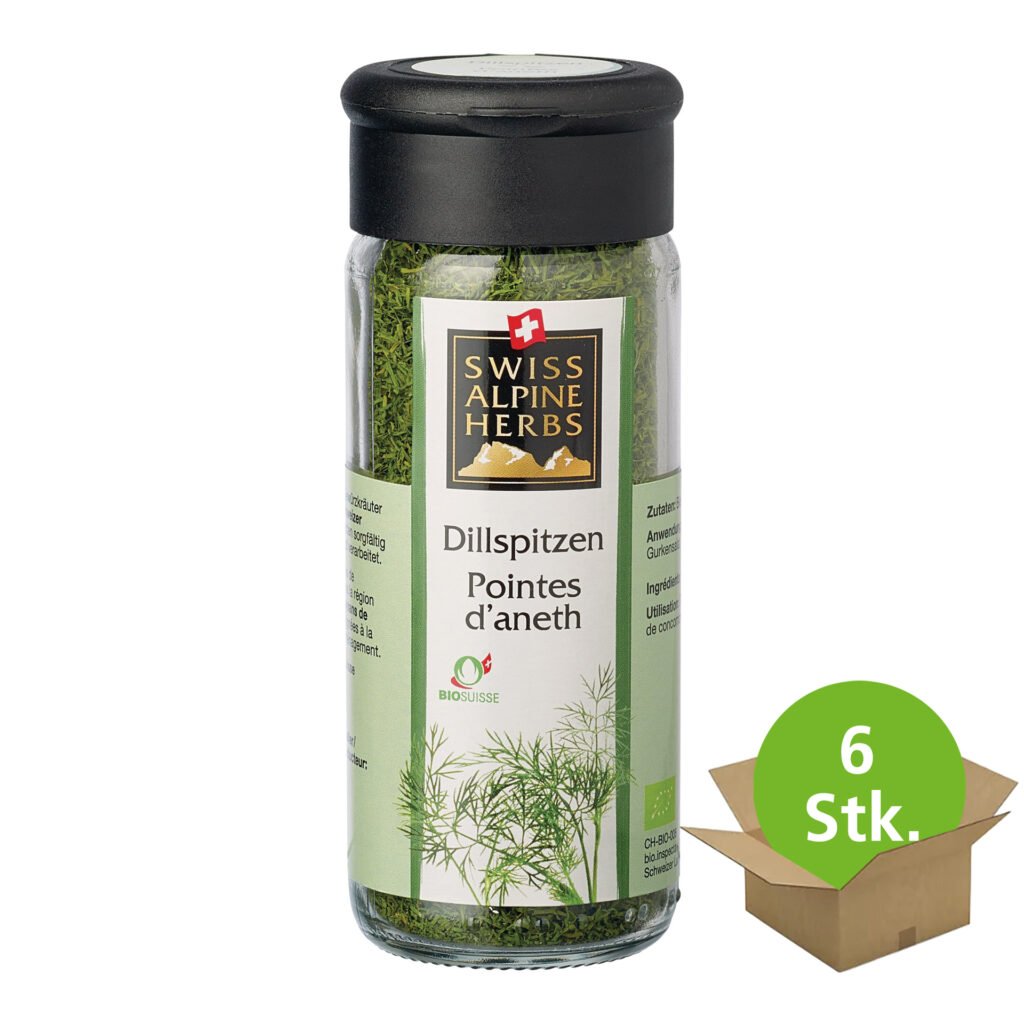 Bio Dillspitzen mit stark-aromatischem Duft. Zart süsslicher Geschmack mit leicht bitterer Note. Ideal für Fischgerichte. Dill (Anethum graveolens), auch Gurkenkraut genannt, ist die einzige Pflanzenart der monotypischen Gattung Anethum und gehört zur Familie der Doldenblütler. Die Verwendung von Dill als Heil- und Gewürzpflanze geht weit zurück bis ins alte Ägypten. Auch heutzutage wird Dill gerne zum Würzen verschiedener Speisen, vor allem Fisch, verwendet und hat seinen festen Platz im Kräutergarten. Swiss Alpine Herbs Bio Dillspitzen harmonieren hervorragend zu Fischgerichten oder punkten in einem Gurkensalat.