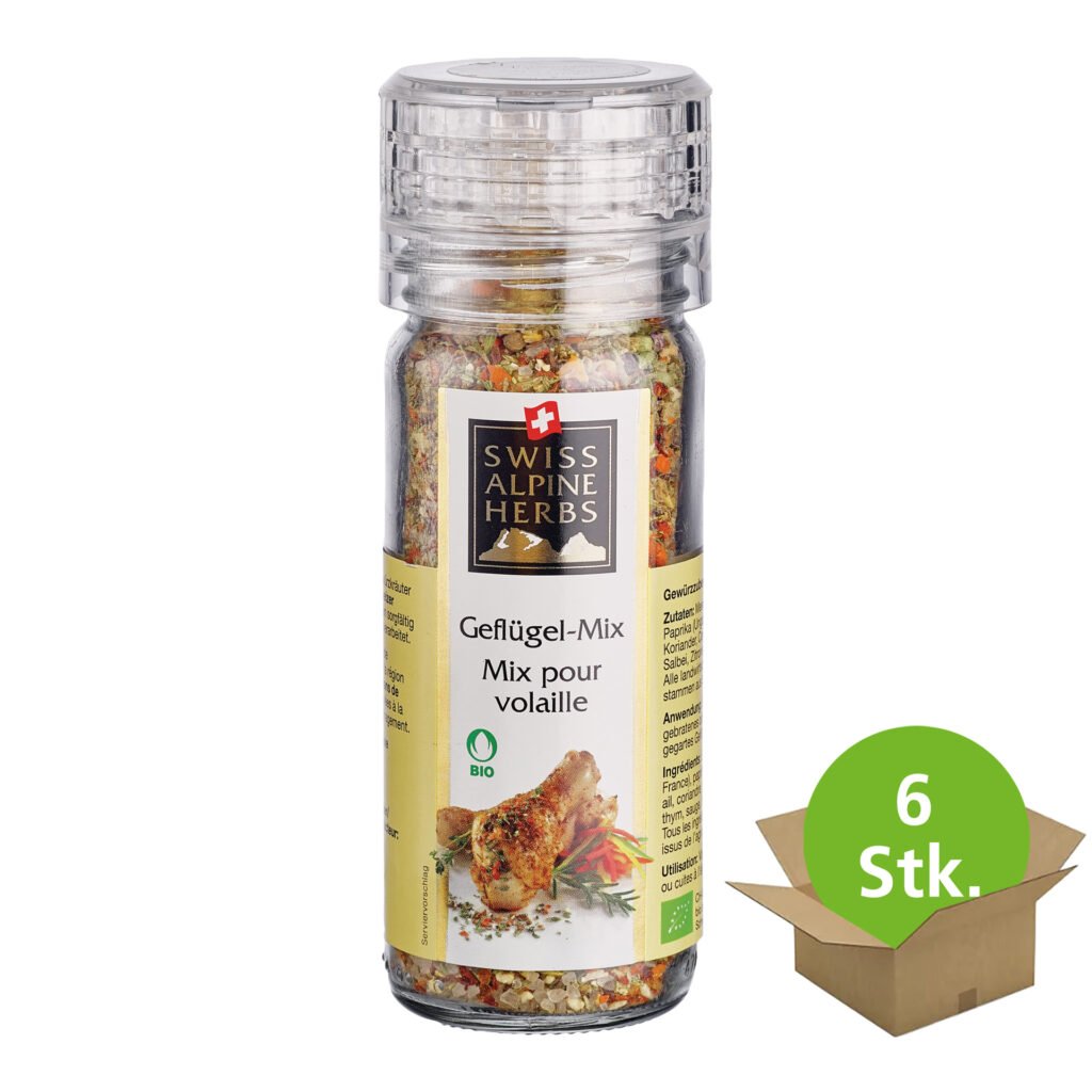 Aromatisch-pikantes Bio Geflügelgewürz Geflügel Mix mit leichter Paprika-Knoblauchnote. Harmonisch abgerundet mit duftigen Alpenkräutern. Mit Swiss Alpine Herbs Bio Geflügel Mühle zaubern Sie im Handumdrehen schmackhafte Geflügel-Grilladen und Geflügelgerichte aller Art. Bei der Komposition dieser 100 % natürlichen Kräutersalz-Mischung haben wir feinste Alpenkräuter wie Rosmarin, Salbei, Thymian, Zitronenthymian und Koriander harmonisch mit Knoblauch, Paprika und grobkörnigem Meersalz zu einer exquisiten Würzmischung kombiniert, die perfekt mit Geflügelfleisch harmoniert. Abgerundet haben wir das Ganze mit etwas Cayennepfeffer aus dem Schweizer Alpenraum.