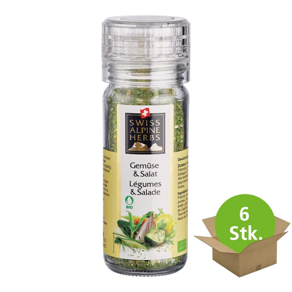 Mild-aromatische Bio Kräutersalz Mischung Gemüse & Salat aus Meersalz und duftigen Alpenkräutern. Swiss Alpine Herbs Bio Gemüse & Salat bringt aromatische Würze und Geschmack in Ihre Speisen. Harmonische, 100 % natürliche Mischung aus grobkörnigem Meersalz, Gemüse wie Karotten, Lauch, Knoblauch und Zwiebeln, fein abgeschmeckt mit aromatischen Kräutern wie Petersilie, Schnittlauch, Estragon, Dill, Fenchel und Cayenne.