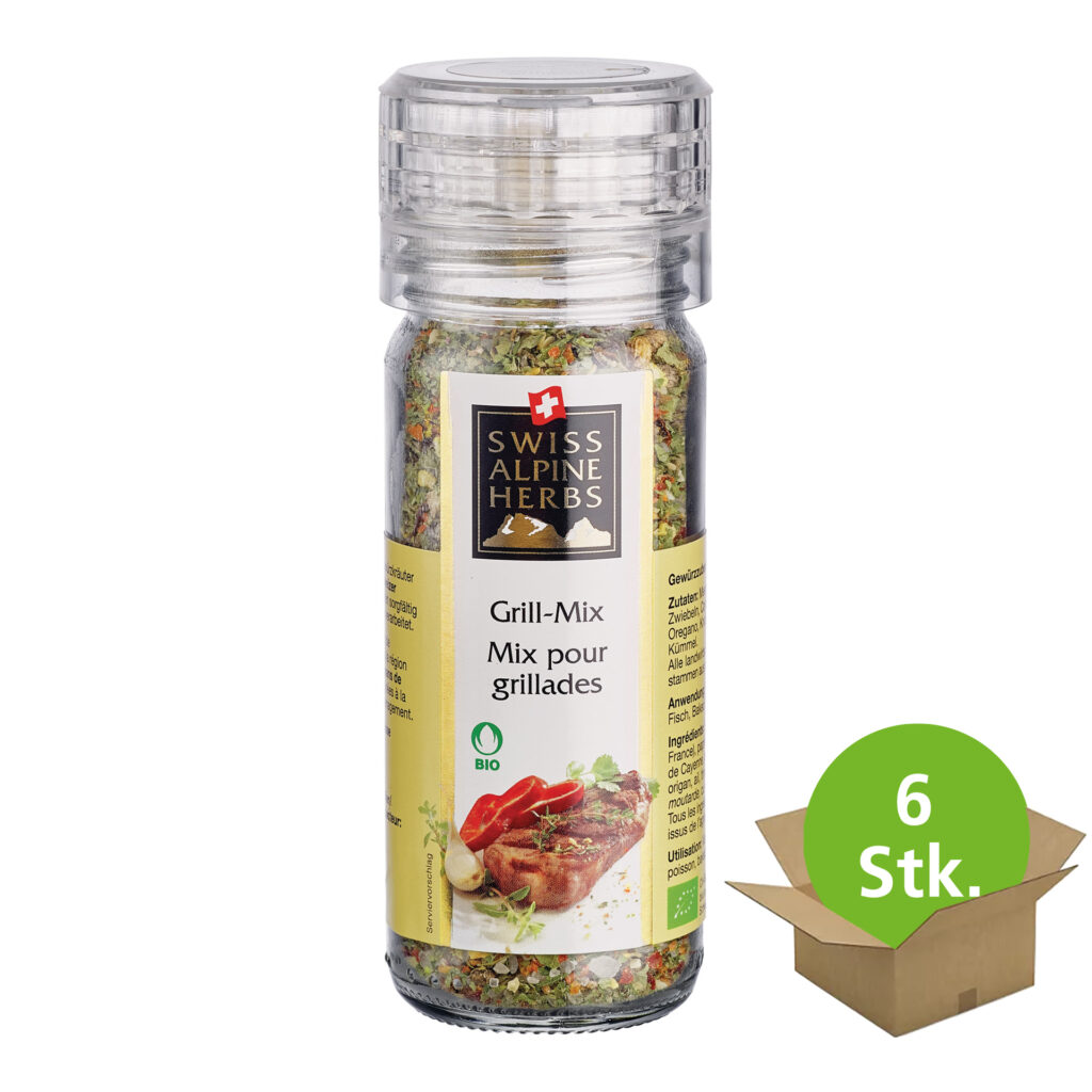 Aromatisch-pikanter Bio Grill Mix aus Meersalz, Paprika und Cayennepfeffer, harmonisch abgerundet mit feinen Kräutern. Holen Sie sich den Duft der Schweizer Alpenkräuterwelt auf Ihren Teller: mit dem unvergleichlichen Grillgewürz Swiss Alpine Herbs Bio Grillmix und werden Sie zum König oder zur Königin des Grillabends. Verfeinern Sie Ihr Grillfleisch und andere Speisen mit der aromatisch-pikanten, köstlichen Grillgewürzmischung aus grobkörnigem Meersalz, Paprika, Kräutern und scharfem Cayennepfeffer aus dem Schweizer Alpenraum. Dieses Produkt ist frei von Zusatzstoffen und 100 % natürlich. Anwendung: frisch über Speisen mahlen.