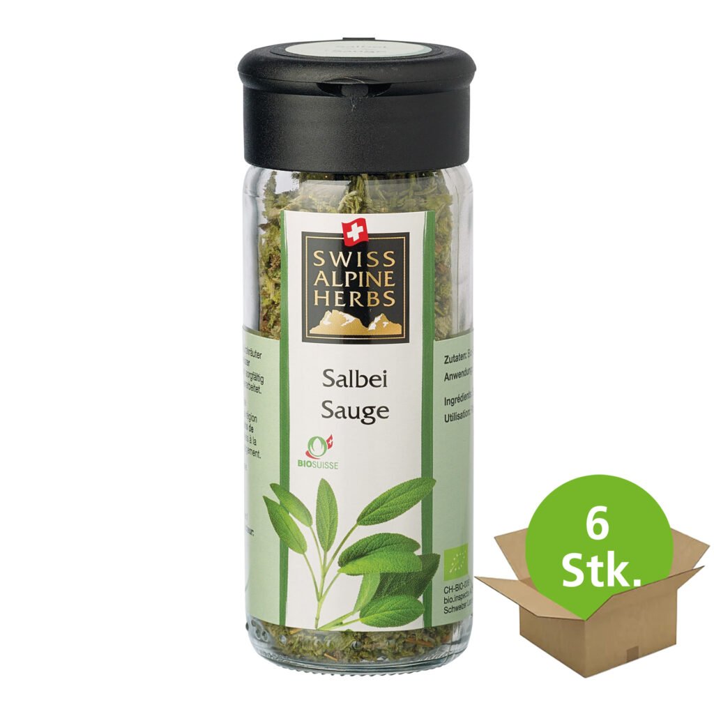 Bio Salbei mit starkem, aromatischem Duft und ausgeprägtem Aroma. Kräftige und leicht bittere Note. Salbei (Salvia) ist eine Pflanzengattung in der Familie der Lippenblütler (Lamiaceae) und kommt sehr artenreich vor. Einige Arten werden seit dem Altertum als Heilpflanze verwendet. In der Küche ist vor allem die Küchensalbei (salvia officinalis) gekannt und beliebt, verfeinert sie mit ihrem aromatischen Geschmack doch einzigartige Weise Saucen oder einen feinen Braten. Swiss Alpine Herbs Bio Salbei verleiht mit seinem ausgeprägten, aromatischen Geschmack vielerlei Saucen eine spezielle Note.