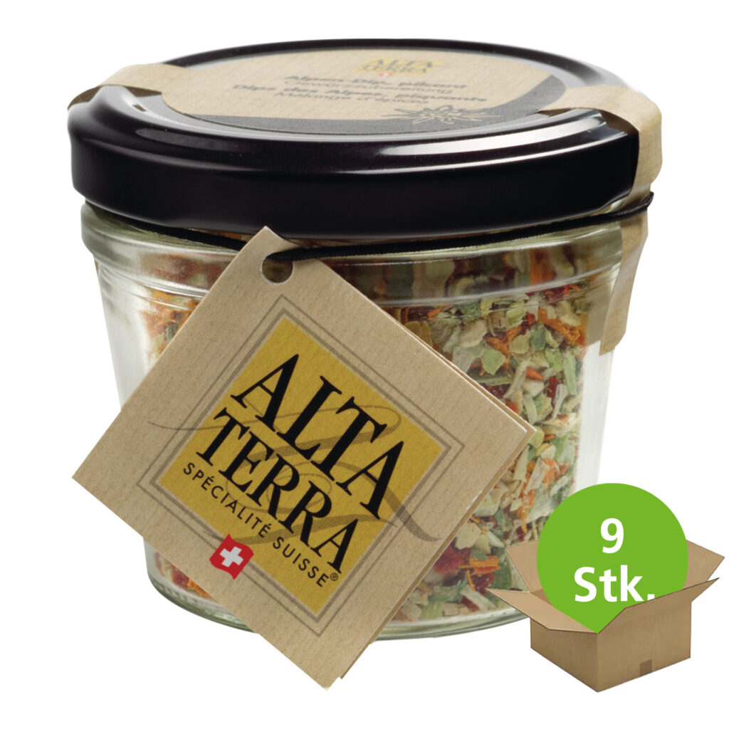 Leicht pikant, würzige Dip Gewürzmischung aus Alpenkräutern, Gewürzen und wenig Salz. Bio Alpen Dip passt ideal zu Grilladen, Gschwellti und rohem Gemüse. Exklusive Mischung mit harmonisch aufeinander abgestimmten Bio Alpenkräutern aus dem Schweizer Alpenraum, verfeinert mit Gewürzen und einem Hauch Knoblauch und Paprika. Aromatisch-würzig und leicht pikant. Hübsch verpackt im dekorativen Glas kann die Alta Terra Alpen-Dip pikant Gewürzmischung ohne Probleme über längere Zeit ohne Qualitätsverlust im Küchenschrank aufbewahrt werden. Bei Spontanbesuch einfach jeweils mit Crème fraîche oder Quark vermischen, ziehen lassen und fertig ist eine nicht alltägliche Dip-Sauce oder ein würziger Begleiter zu Ihren Grilladen. In dieser exklusiven Dip Gewürzmischung haben wir den Duft und das Aroma der Alpen für Sie eingefangen…probieren Sie selbst.