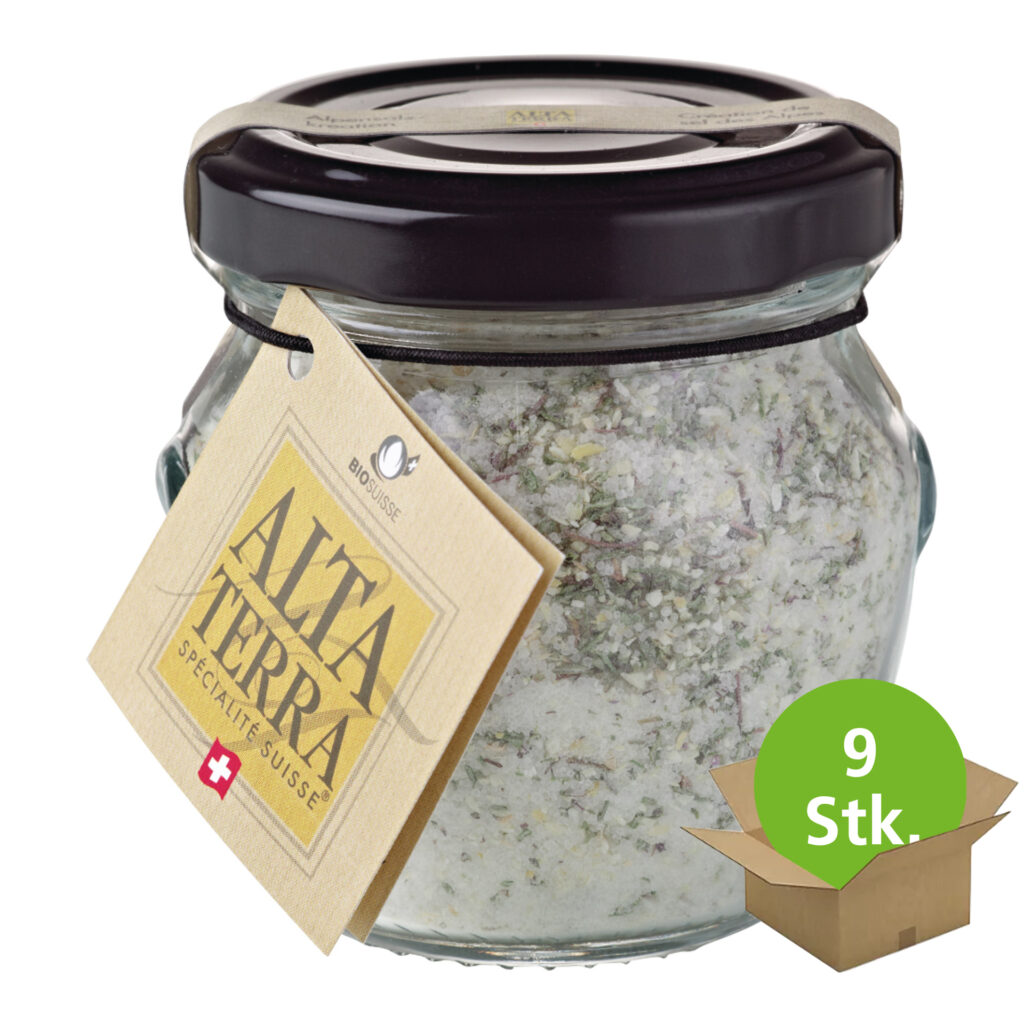 Knoblauchig-kräuterig und einfach herrlich zum würzen von Speisen aller Art – unser Bio Schweizer Alpensalz mit Knoblauch und Thymian. Das Alta Terra Schweizer Alpensalz mit Knoblauch und Thymian schmeckt herrlich knoblauchig-kräuterig und verleiht allen Speisen eine spezielle Note. Eine herrliche Kräutersalz Kreation aus reinem Alpensalz aus den Salzminen von Bex und intensiv-aromatischem Bio Knoblauch und Bio Thymian aus den Schweizer Alprenreginen. Sorgfältig hergestellt mit Leidenschaft für die gute Küche.