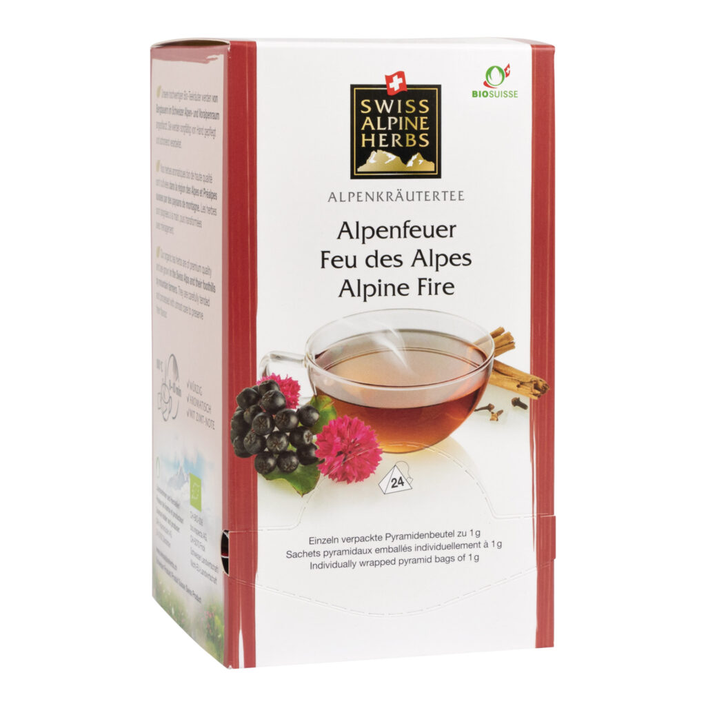 Vollmundiger Bio Kräutertee Alpenfeuer von Swiss Alpine Herbs mit sinnlicher, wärmender Winternote und einem Hauch von Zimt und Nelken. Leicht würziger, wärmender Wintertee aus Bio Alpenkräutern, Beeren und Gewürzen. Verwöhnt den Gaumen mit einer leichten Zimt und Nelken Note und erinnert an kalte Wintertage. Swiss Alpine Herbs Bio Tee Alpenfeuer schmeckt vollmundig und besticht durch seine schöne, natürliche, rote Farbe. Sorgt für Abwechslung auf dem Teebuffet. Attraktive Teebox mit 24 einzelnen Teeportionen.