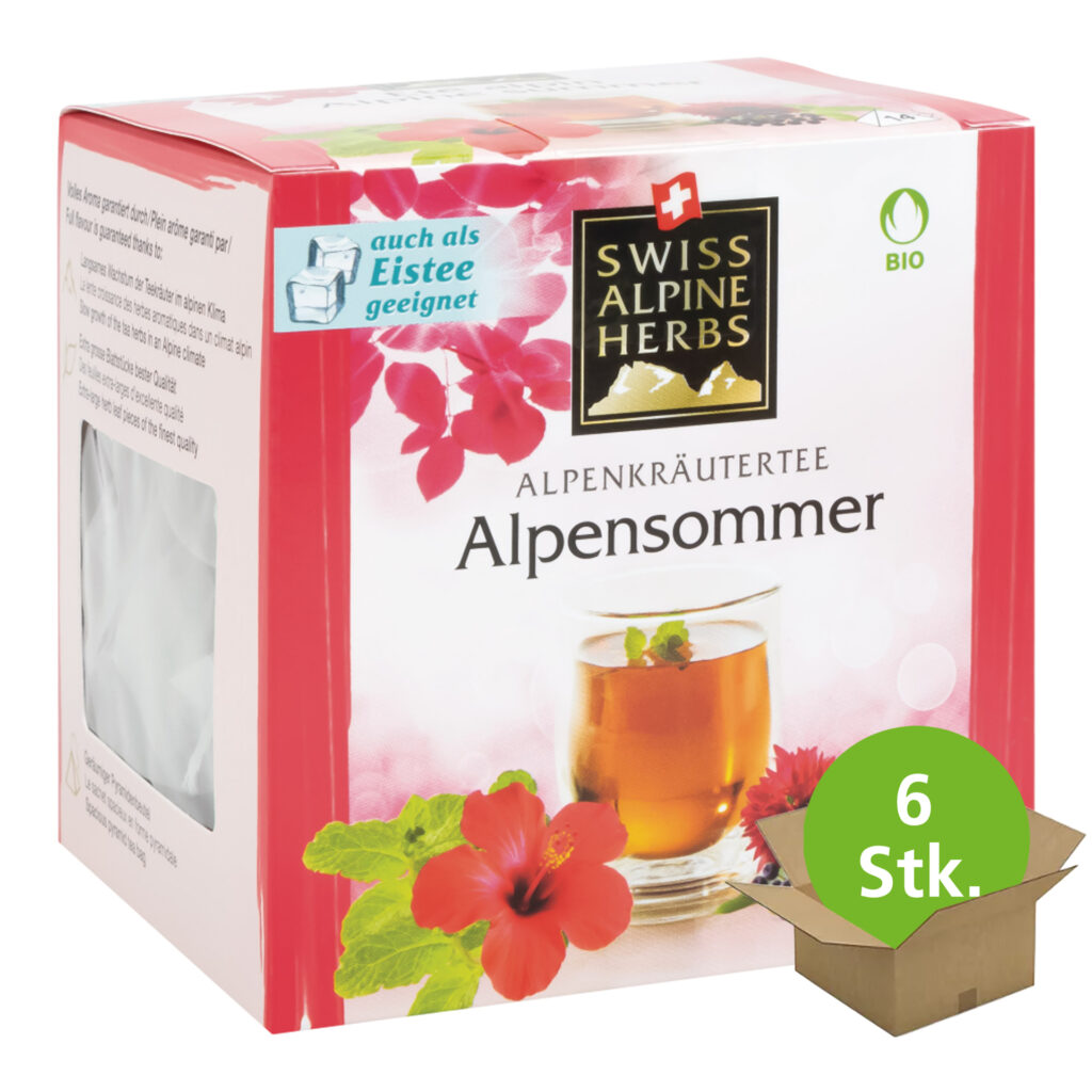 Bio Alpensommer – erfrischend-minziger Kräutertee von Swiss Alpine Herbs aus Pfefferminze, Aroniabeeren und Hibiscus mit fruchtig-blumiger Note. Auch zum kalt trinken. Erfrischend-minzig mit fruchtig-blumiger Note dank einer wunderbaren Komposition aus Pfefferminze, Aronia und Hibiscus. Swiss Alpine Herbs Bio Kräutertee Alpensommer verwöhnt im Sommer mit seiner wunderbar roten Farbe und einem köstlichen, erfrischenden Geschmack. Kann an heissen Sommertagen auch als erfrischender Durstlöscher genossen werden.