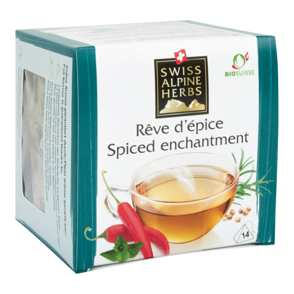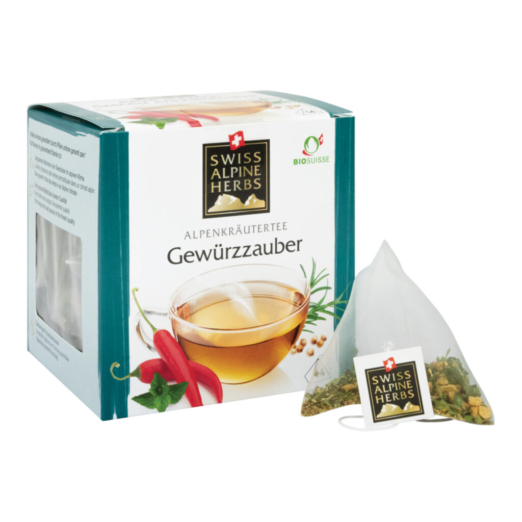 Ein bekömmlicher Seelenwärmer mit Alpenchili. Dieser würzig-aromatische, leicht pikante Bio Kräutertee von Swiss Alpine Herbs überrascht und ist einfach zauberhaft gut. Ein Zauber, der in seinen Bann zieht! Bei diesem würzig-aromatischen Kräutertee prickelt die Schärfe der Alpenchilis angenehm fein auf der Zunge, meldet sich das bekömmliche Duo Fenchel und Kümmel zu Wort und rundet die liebliche Süsse des Apfels das Bouquet harmonisch ab. Swiss Alpine Herbs Bio Tee Gewürzzauber überrascht, bezaubert und wärmt die Seele.