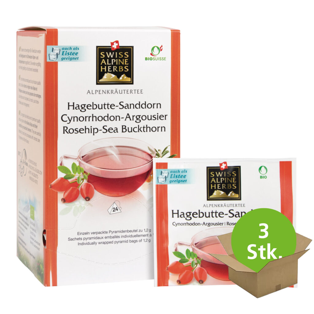Bio Kräuter- und Früchtetee von Swiss Alpine Herbs mit Schweizer Hagebutten und Sanddorn abgerundet mit Blüten. Fruchtig-säuerlich. Hagebuttentee ist einer der beliebtesten Früchtetees überhaupt und sollte auf keinem Teebuffet fehlen. Die Kräuter- und Früchtetee Kreation von Swiss Alpine Herbs Bio Tee Hagebutte und Sanddorn besticht durch eine wunderbar natürliche, rote Farbe und das typische fruchtig-säuerliche und leicht herbe Aroma. Eine genussvolle Teemischung aus Schweizer Hagebutte, Sanddorn, Apfelstücken, Rosenblüten und Ringelblumen für den täglichen Teegenuss. Im attraktiven Display für Ihr Teebuffet.
