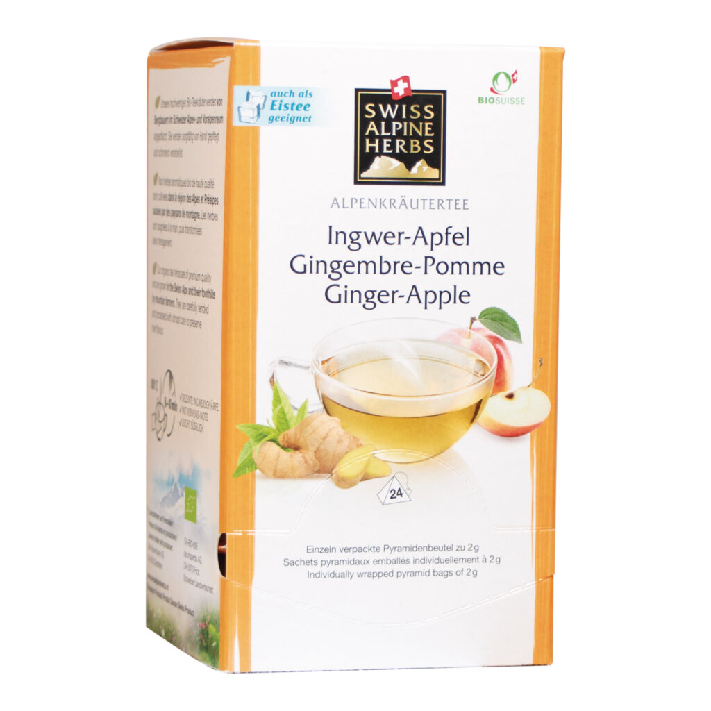 Vitalisierend, mit leichter aromatische Schärfe in Kombination mit lieblichem Apfel. Unser bio Ingwer-Apfel Tee von Swiss Alpine Herbst ist ideal für einen schwungvollen Tag oder wärmt wohlig in den kalten Wintertagen. Mit diesem Tee von Swiss Alpine Herbs kommen Sie schwungvoll durch den Tag. Der Swiss Alpine Herbs Bio Tee Ingwer-Apfel ist eine anregende Symphonie von Schweizer Bio Ingwer und besticht durch aromatische Schärfe in Kombination mit lieblichem Apfel. Zusätzlich hat der Ingwer-Apfel Tee eine dezente Kräuternote, ist fruchtig und mit seiner belebenden Wirkung ist er gerade richtig für den Einstieg in einen neuen Tag oder wärmt wohlig an kalten Tagen.