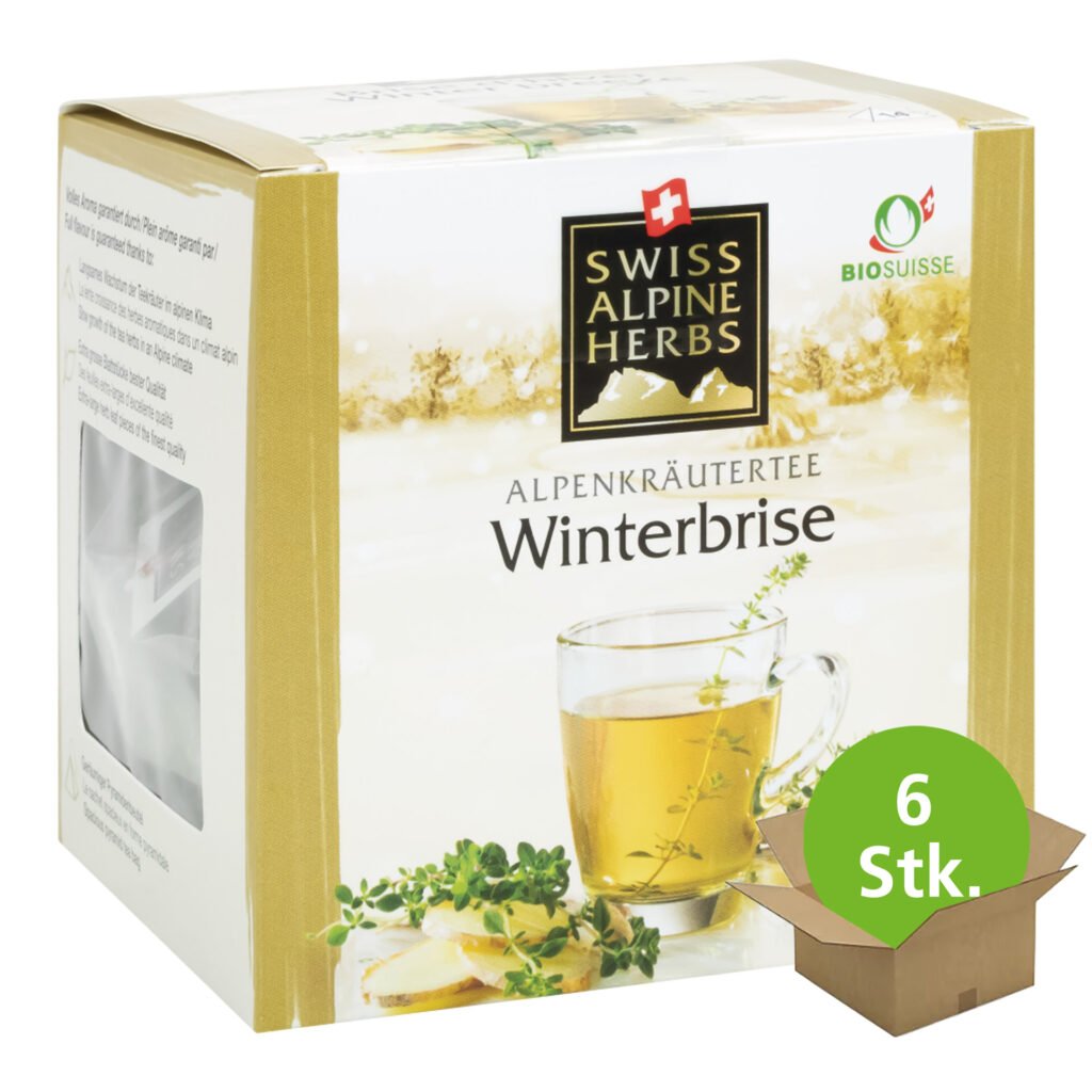 Erfrischender Zitronenthymian abgerundet mit einem Hauch würzigem Ingwer. Unser Bio Kräutertee Winterbrise von Swiss Alpine Herbs verwöhnt mit wohltuender Wärme. Herrliche Kräutertee Komposition für kalte Wintertage. Wärmender, leicht scharfer und würziger Ingwer in wunderbarer Harmonie mit erfrischendem Zitronenthymian aus dem Schweizer Alpenraum. Teegenuss pur für Körper, Geist und Seele.