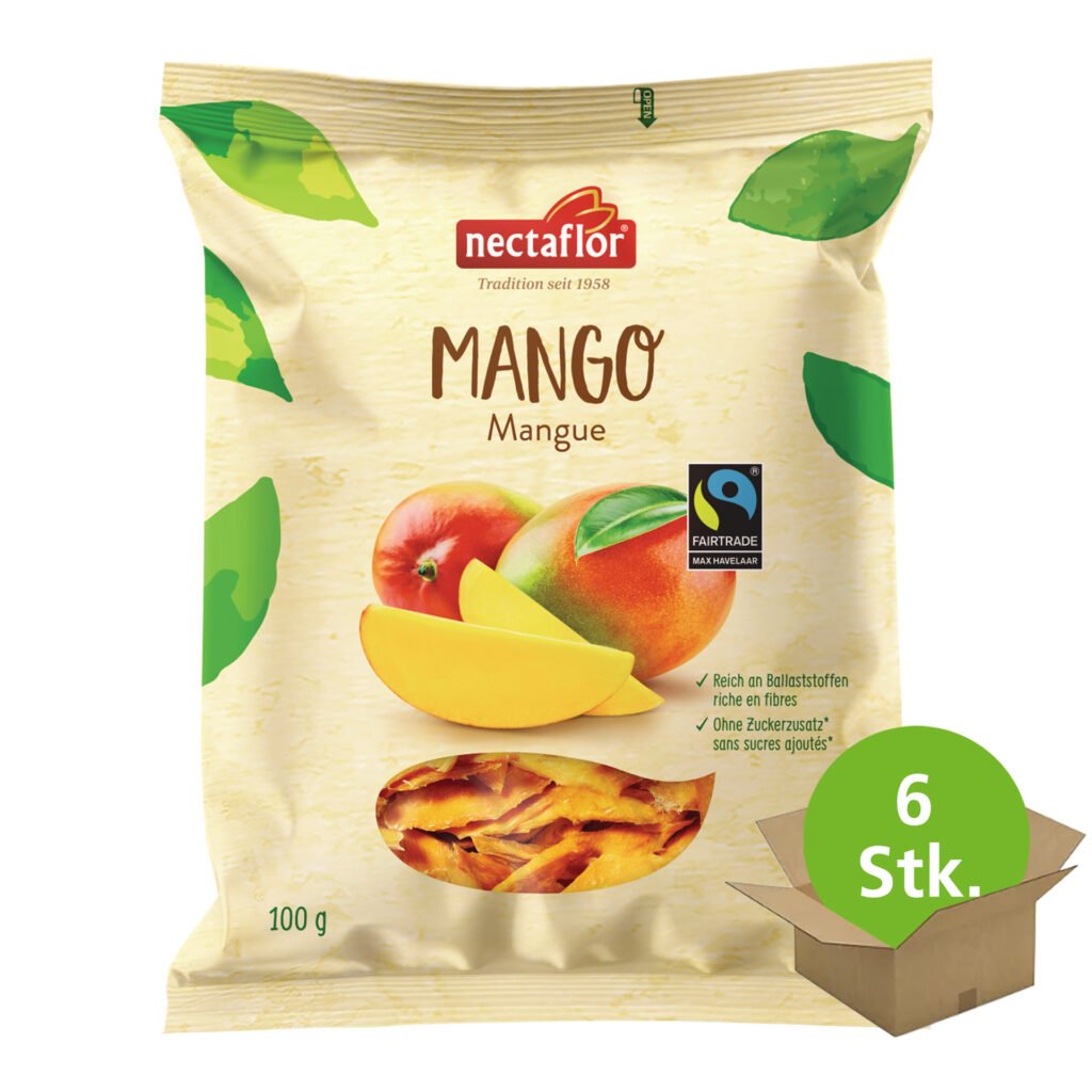 Exotisch, fruchtig, aus fairem Handel – diese Mango Schnitze sind leckere Energielieferanten für Freizeit, Arbeit und Sport! Diese sonnengereiften Mangos werden von Fairtrade-Produzenten angebaut sowie nach den Max Havelaar Fairtrade-Standards zertifiziert und gehandelt. Fairtrade fördert bessere Arbeits- und Lebensbedingungen für zertifizierte Produzenten sowie den Umweltschutz. Diese Mangos haben einen ausgeprägt fruchtig-exotischen Geschmack. Sie sind fettfrei und enthalten viele Ballaststoffe. Damit die getrockneten Mangoschnitze ihre schön orange Farbe behalten, werden sie leicht geschwefelt. Mangos von nectaflor sind ein gesunder Snack für zwischendurch und natürliche Energielieferanten für Freizeit, Arbeit und Sport. Roh oder eingeweicht verleiht der fruchtige Mangogeschmack auch einer Vielzahl von pikanten und süssen Gerichten den letzten Schliff.