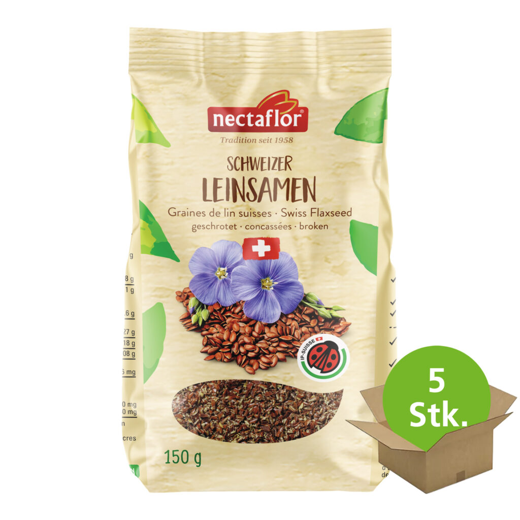 Heimisches Superfood par excellence – reich an Ballaststoffen und Omega-3-Fettsäuren sowie eine gute Proteinquelle. Leinsamen werden aus den Samen des Flachs gewonnen. Diese Pflanze gehört zu den ältesten Kulturpflanzen, die in der Schweiz seit Jahrhunderten zur Faser- und Ölgewinnung angebaut werden. Reich an Omega-3-Fettsäuren und Ballaststoffen sowie eine wertvolle Proteinquelle sind die geschroteten Schweizer Leinsamen von nectaflor ein wahres, heimisches Superfood. Sind die Leinsamen geschrotet, kann der Körper die Nährstoffe schnell und einfach aufnehmen und die Verdauung wird positiv beeinflusst.