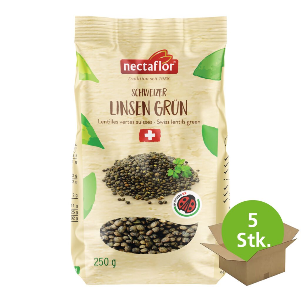 IP-Suisse Linsen grün aus dem Berner Seeland. Hervorragende Proteinquelle als Beilage oder Salat Nectaflor Schweizer Linsen grün 250g. Im Seeland gewachsen sind diese grünen Linsen reich an Proteinen, Mineralien Vitaminen und Ballaststoffen. Angebaut nach IP-Suisse Richtlinien, welche einen umweltfreundlichen, und respektvollen Umgang mit Mensch und Natur garantiert. Die dunkelgrüne Sorte Anicia, mit ihrem leicht nussigen Aroma, ist festkochend und darum auch hervorragend als Salat einsetzbar.