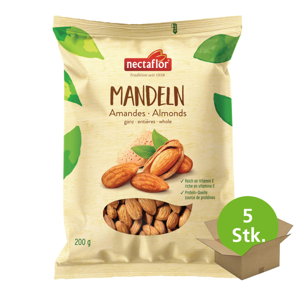 Knackiger Knabberspass – Mandeln in Supreme-Qualität aus Kalifornien sind garantiert frei von Bittermandeln. Die knackige Versuchung mit hohem Mineral-, Vital- und Ballaststoff-Gehalt: nectaflor Mandeln ganz, ungeschält aus Kalifornien zeichnen sich aus mit ihrem mildem, typisch-aromatischem Mandelaroma und ihrer schönen Form und Grösse. Sie sind von bester Nonpareil Supreme Qualität und garantiert frei von Bittermandeln. Die vermeintliche Edelnuss Mandel ist botanisch gesehen keine Nuss, sondern ein Steinobst. Sie ist gesund und liefert viele ungesättigte Fettsäuren, wertvolle Mineralstoffe wie Calcium, Magnesium und Kupfer und viel Vitamin B und E. Sie ist nicht nur ein beliebter Power Snack für Zwischendurch, sondern hat mit ihrem mild-süssen Aroma längst ihren Platz in der cholesterinarmen, rohkostbasierten und veganen Küche erobert.