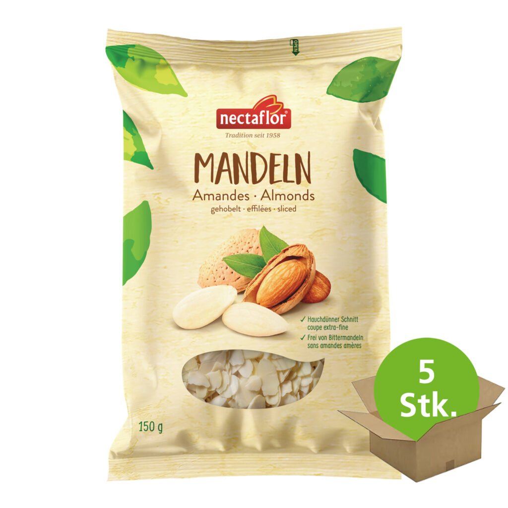 Mandeln gehobelt und hauchdünn geschnitten. Beliebte und vielseitige Zutat in der süssen und pikanten Küche. Die Mandeln für nectaflor Mandeln gehobelt stammen aus Kalifornien und sind – im Gegensatz zu den meisten Mandeln aus Europa – 100% frei von Bittermandeln. Sie bestechen durch ein mildes, aromatisches und typisches Mandelaroma. Aus Qualitätsgründen werden die Mandeln erst kurz vor dem Transport in die Schweiz geknackt, geschält und zu hauchdünnen, gleichmässigen Mandelblättchen geschnitten. Roh oder geröstet ideal zur Verfeinerung oder Dekoration von Speisen aller Art.