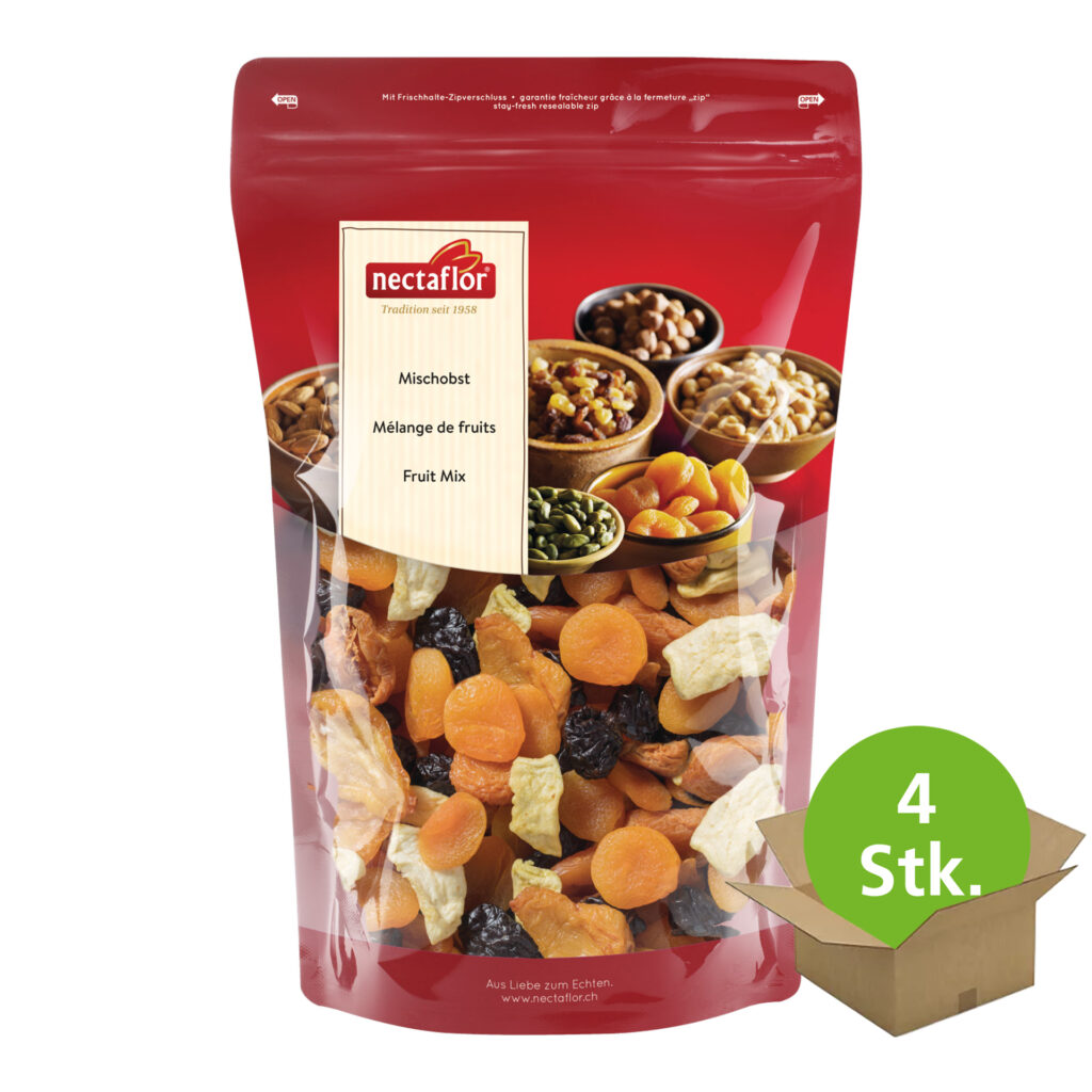 Vollmundig im Geschmack ist dieses Mischobst ein vielseitiger Genuss – aus handsortierten Äpfeln, Aprikosen, Pflaumen, und Birnen. Diese leckere Trockenfrucht-Mischung bietet vielseitigen Fruchtgenuss. Handsortierte, extra-weiche Apfelstücke, entsteinte ganze Pflaumen, aromatische Aprikosen und vollmundigen Birnenhälften sind in dieser Mischung zu einem genussvollen Ganzen vereint. nectaflor Mischobst enthält viele Ballaststoffe und ist fett- und salzarm. Diese Trockenfrüchte sind ideal als natürlicher Energielieferant auf dem Frühstücks- oder z’Vieri-Buffet und verfeinern süsse und pikante Gerichte.