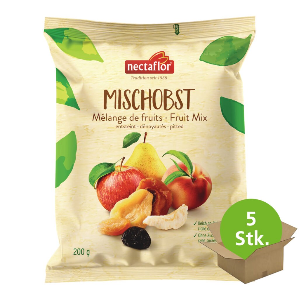 Vielseitiger Genuss bietet dieses Mischobst aus handsortierten Äpfeln, Pflaumen, Aprikosen und Birnen – weich im Biss, vollmundig im Geschmack. Die feine Mischung für den anspruchsvollen Geniesser besteht aus handsortierten, extra-weichen Apfelstücken, entsteinten ganzen Pflaumen und Aprikosen sowie vollmundigen Birnenhälften. nectaflor Mischobst ist fett- und salzarm und enthält viele Ballaststoffe. Diese Trockenfrüchte sind ein gesunder Snack für zwischendurch und natürliche Energielieferanten für Freizeit, Arbeit und Sport.