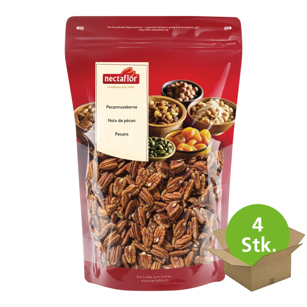 Die edlen Pekannusskerne gehören zur Familie der Walnüsse, schmecken aber leicht süsser und aromatischer. Pekannüsse gehören zur Familie der Walnüsse und stammen ursprünglich aus den USA. Im Gegensatz zu ihrem Bruder schmecken die edlen, dunkelhäutigen Pekannüsse allerdings aromatischer, milder und «süsser». nectaflor Pekannusskerne bestechen mit schönen regelmässigen Hälften und angenehm weichem Biss. Vollgepackt mit ungesättigten Fettsäuren, Spurenelementen und Mineralstoffen eignen sie sich als edle Zutat in vielerlei Speisen und Desserts.