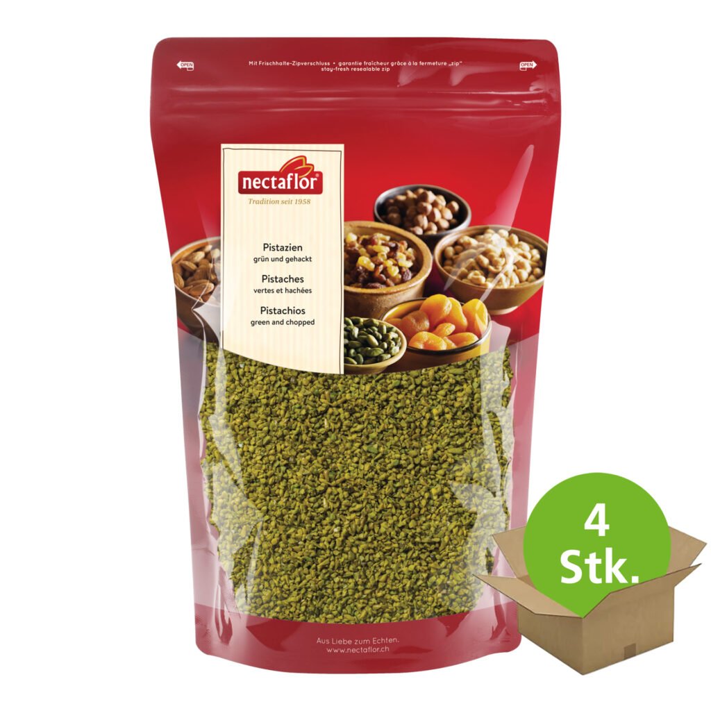Würzig, mandelartig im Geschmack. Pistazien grün, gehackt verfeinern Gebäck, Konfekt und Desserts aller Art. Convenience für die Feinschmecker Küche: die edlen Pistazien für nectaflor Pistazien grün gehackt, ungesalzen werden sofort nach der Ernte vorsichtig geschält, von ihren Häutchen befreit, getrocknet und anschliessend gehackt. Sie verleihen mit ihrem mandelartigen, leicht würzigen Geschmack süssen und pikanten Speisen eine spezielle Note oder veredeln Desserts aller Art.