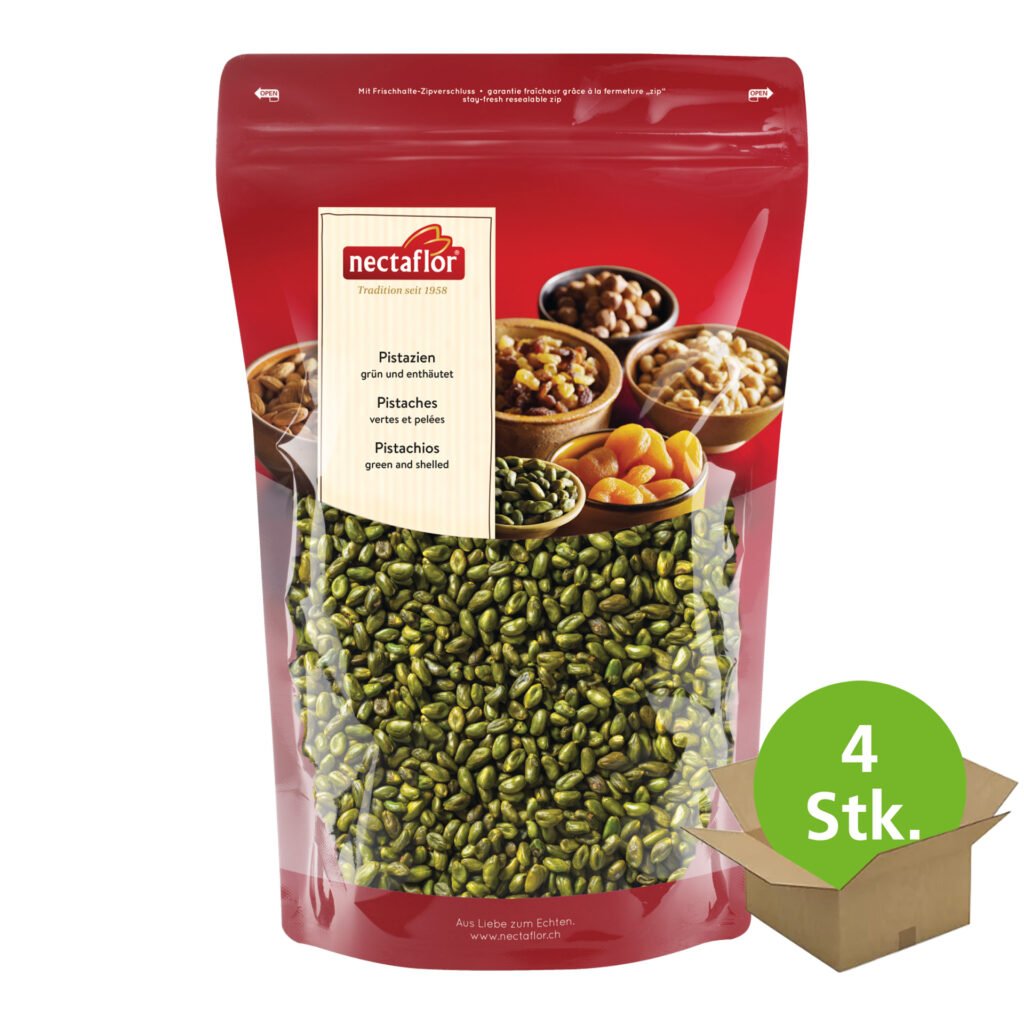 Die leuchtend grünen, geschälten Pistazienkerne eignen sich bestens zum Kochen, Backen und dekorieren von Konfekt aller Art. nectaflor Pistazien grün, geschält sind 100 % natürlich und schmecken würzig-mandelartig. Mit ihrer schönen grünen Farbe und dem angenehmen Aroma bereichern sie die süsse und pikante Küche gleichermassen. Aus Qualitätsgründen werden die Pistazien für dieses Convenience Produkt unmittelbar nach der Ernte geschält, gehäutet und getrocknet..