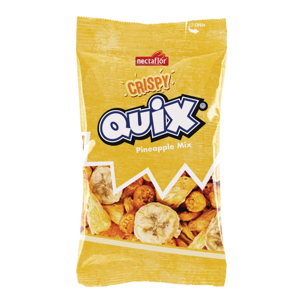 Revolutionär knuspriger Fruchtsnack aus Ananas, Physalis und Banane. 100% natürlich, luftig-leicht und super aromatisch. Trockenfrüchte mal anders. Dieser revolutionär knusprige Snack besteht aus purer Frucht, ist luftig-leicht und ohne jegliche Zusätze super aromatisch. Dafür sorgt ein innovatives und schonendes Verfahren aus Vakuum und Druck. Knusprige Ananas, Physalis und Banane sorgen für süss-säuerlichen und exotischen Knabberspass für unterwegs und zwischendurch. Der vegane nectaflor Quix Crispy Pineapple Mix ist handlich klein und passt in jede Tasche.