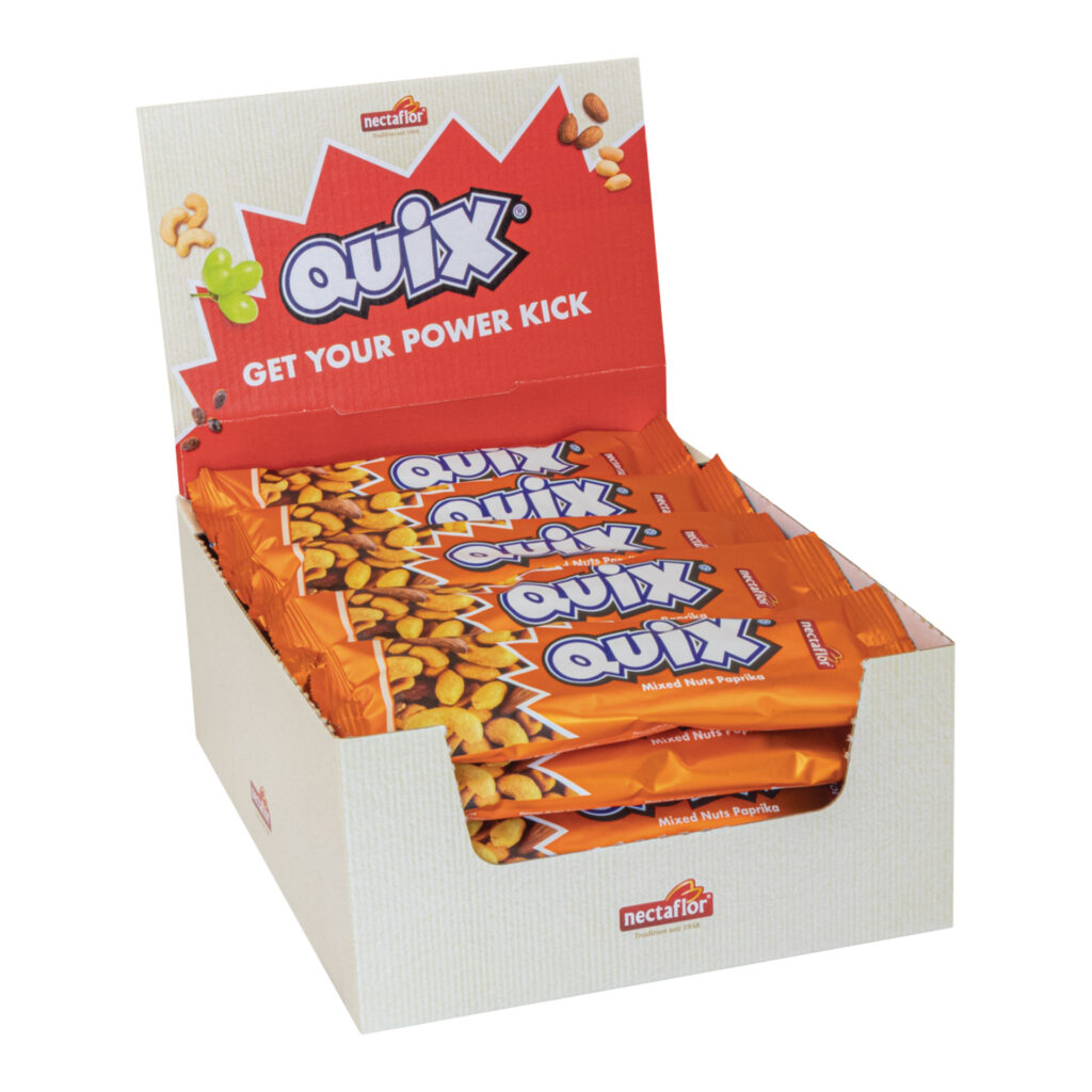 Nectaflor QUIX Mixed Nuts Paprika – ein trendiger Nuss – Snack aus Mandeln, Cashews und Erdnüssen, leicht geröstet und gewürzt. Hier meldet sich Paprika zu Wort. Nectaflor QUIX Mixed Nuts Paprika vereint gewürzte Mandeln, Erdnüsse und Cashews zu einem leckeren Snack. Leicht geröstet und veredelt mit einer feinen Paprika-Würzmischung ist diese Nussmischung ein beliebter Begleiter für unterwegs, zuhause oder im Büro.