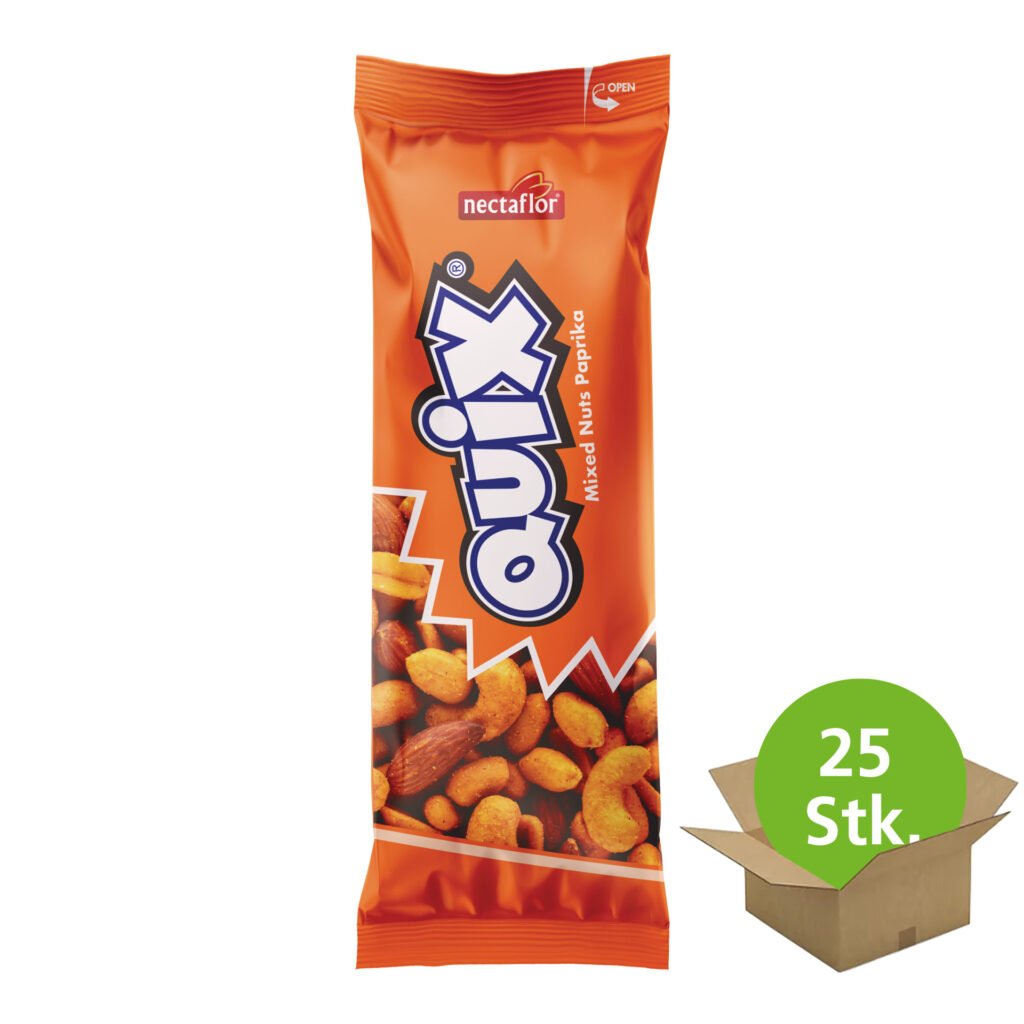 Nectaflor QUIX Mixed Nuts Paprika – ein trendiger Nuss – Snack aus Mandeln, Cashews und Erdnüssen, leicht geröstet und gewürzt. Hier meldet sich Paprika zu Wort. Nectaflor QUIX Mixed Nuts Paprika vereint gewürzte Mandeln, Erdnüsse und Cashews zu einem leckeren Snack. Leicht geröstet und veredelt mit einer feinen Paprika-Würzmischung ist diese Nussmischung ein beliebter Begleiter für unterwegs, zuhause oder im Büro.