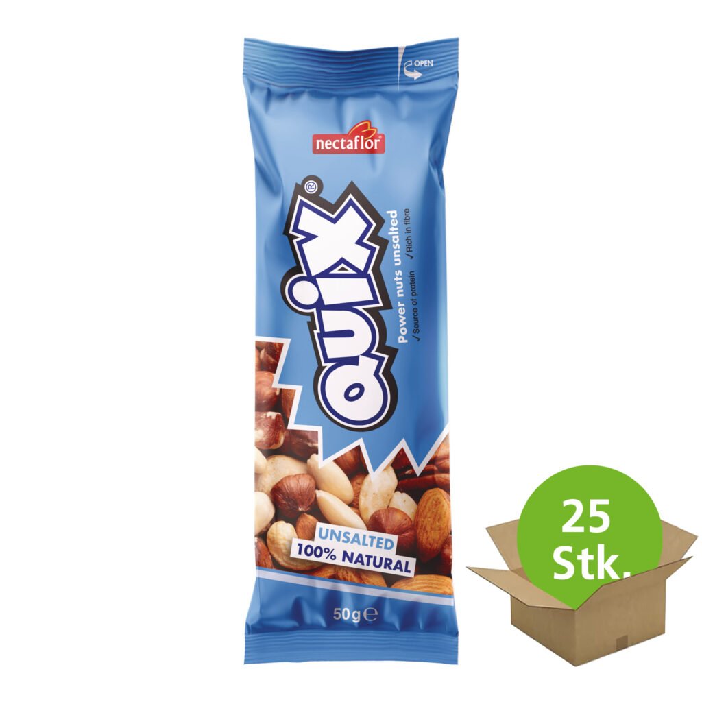 Leckerer Nuss-Snack aus Mandeln, Cashews, Pekan- und Haselnüssen: ungesalzen und handlich portioniert. Knackig, lecker und gesund: Nüsse-Naschen wirkt sich positiv auf die Gesundheit aus, sättigt und liefert Energie für Kopf und Körper. Nicht umsonst werden Nüsse auch gerne als Brainfood, Nervennahrung oder Energie-Snack bezeichnet. Diese schmackhafte nectaflor QUIX Nussmischung ist naturbelassen und ungesalzen. Sie ist reich an Vitamin E und eine wertvolle Protein-Quelle. Die praktische Einzelportion ist ideal für unterwegs und zwischendurch.