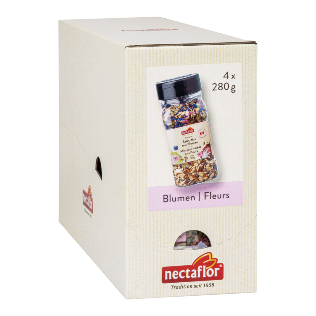 Eine wahre Augenweide! Verzaubern Sie jeden Salat in ein Gourmet-Essen mit dem Schweizer Salat-Mix aus Kernen und Blumen. Augenweide und Genuss auf dem Salatteller pur! Dieser nectaflor Gourmet Schweizer Salat Mix Blumen verzaubert optisch und verwöhnt kulinarisch. Eine aromatische Kreation aus Schweizer Sonnenblumenkernen, Raps, Leinsamen, Kräutern, rosa und blauen Kornblumen sowie einem Hauch Paprika.