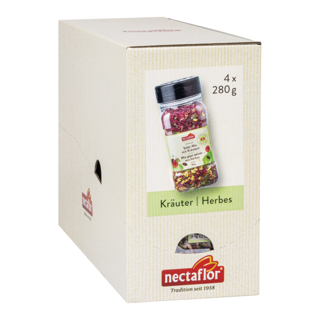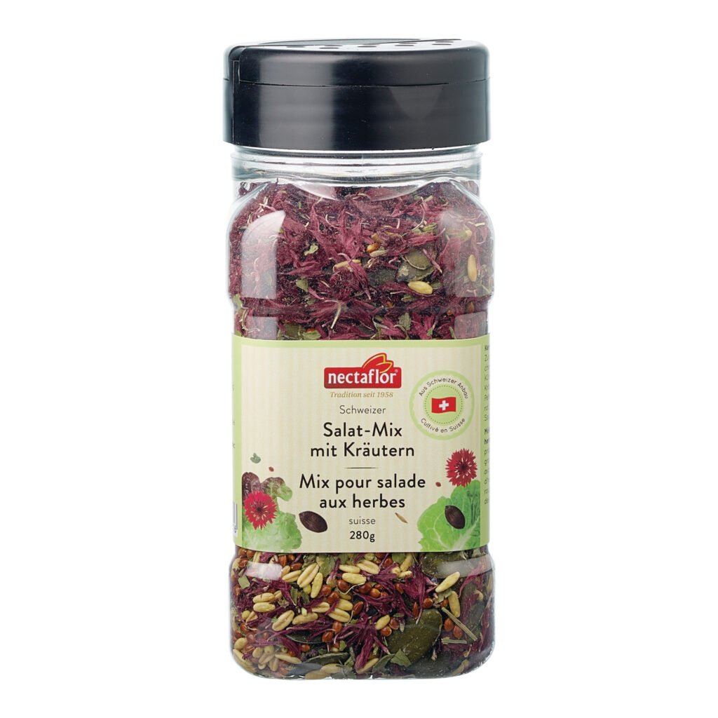 Knackig im Biss, kräuterig-aromatisch im Geschmack. Schweizer Salat Mix mit Kernen und Kräutern aus Kürbiskernen, Hafer und Hirse und feinen Kräutern. Dieser nectaflor Schweizer Salat Mix Kräuter sorgt für kräuterig-aromatische Geschmacksexplosionen in ihrem Salat. Knackige Schweizer Kerne wie Kürbiskerne, Hirse und Hafer vereinen sich mit einer feinen Kräutermischung zu einem harmonischen Ganzen.