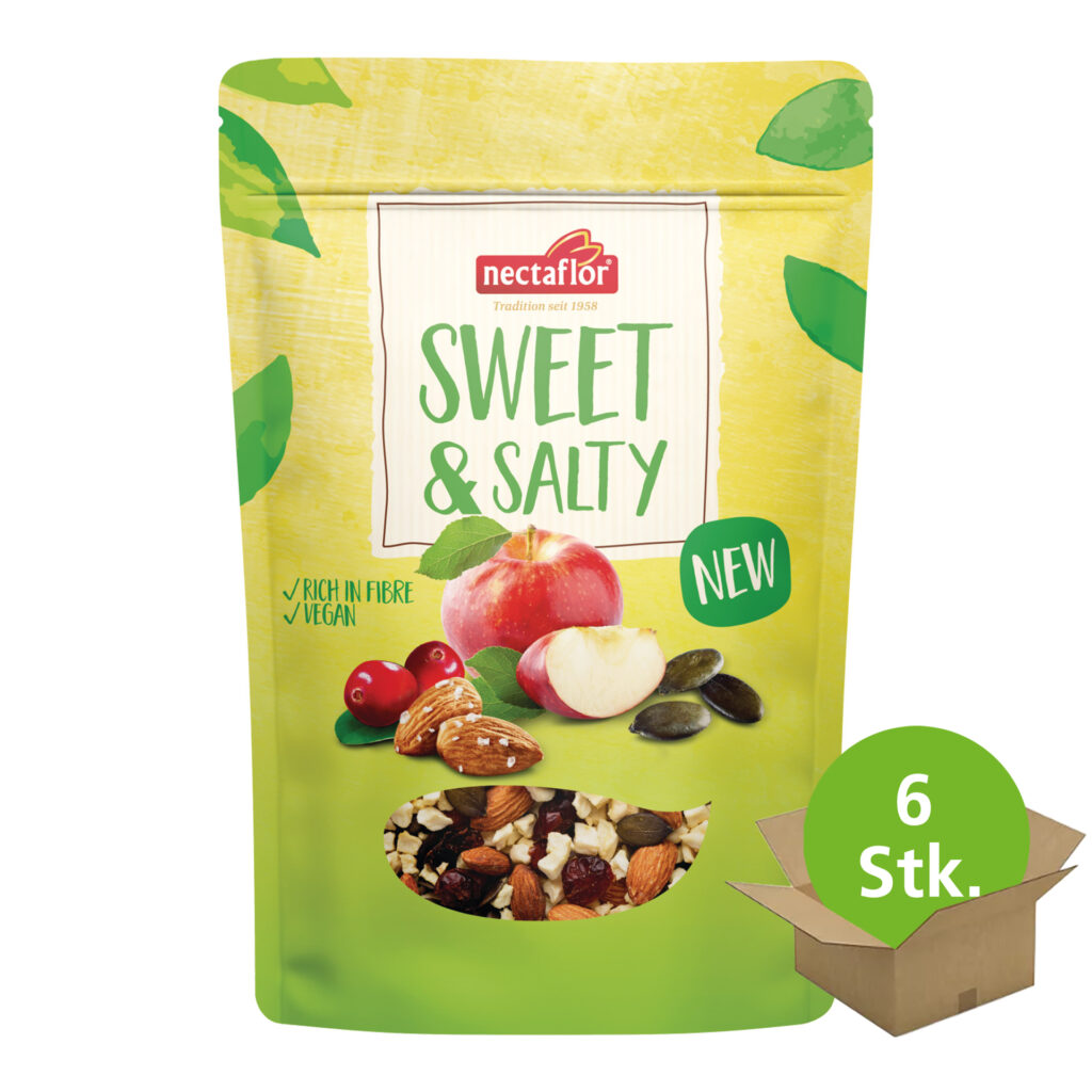 Süss-salziger Fitmix, vollgespickt mit wertvollen Proteinen. Power-Snack für Aktive, der Energie liefert und viele Ballaststoffe enthält. Sweet & Salty ist ein süss-salziger Fitmix, der eine moderne Ernährungsweise und einen aktiven Lebensstil unterstützt. Die ausgewogene Mischung enthält getrocknete Äpfel, Cranberries, Kürbiskerne sowie geröstete und gesalzene Mandeln. Die Früchte liefern eine geballte Portion Energie, die gesalzenen Mandeln helfen den Salzhaushalt nach körperlicher Anstrengung zu regulieren und die Kürbiskerne bringen wertvolle Proteine. Verpackt im praktischen, wiederverschliessbaren Standbeutel.