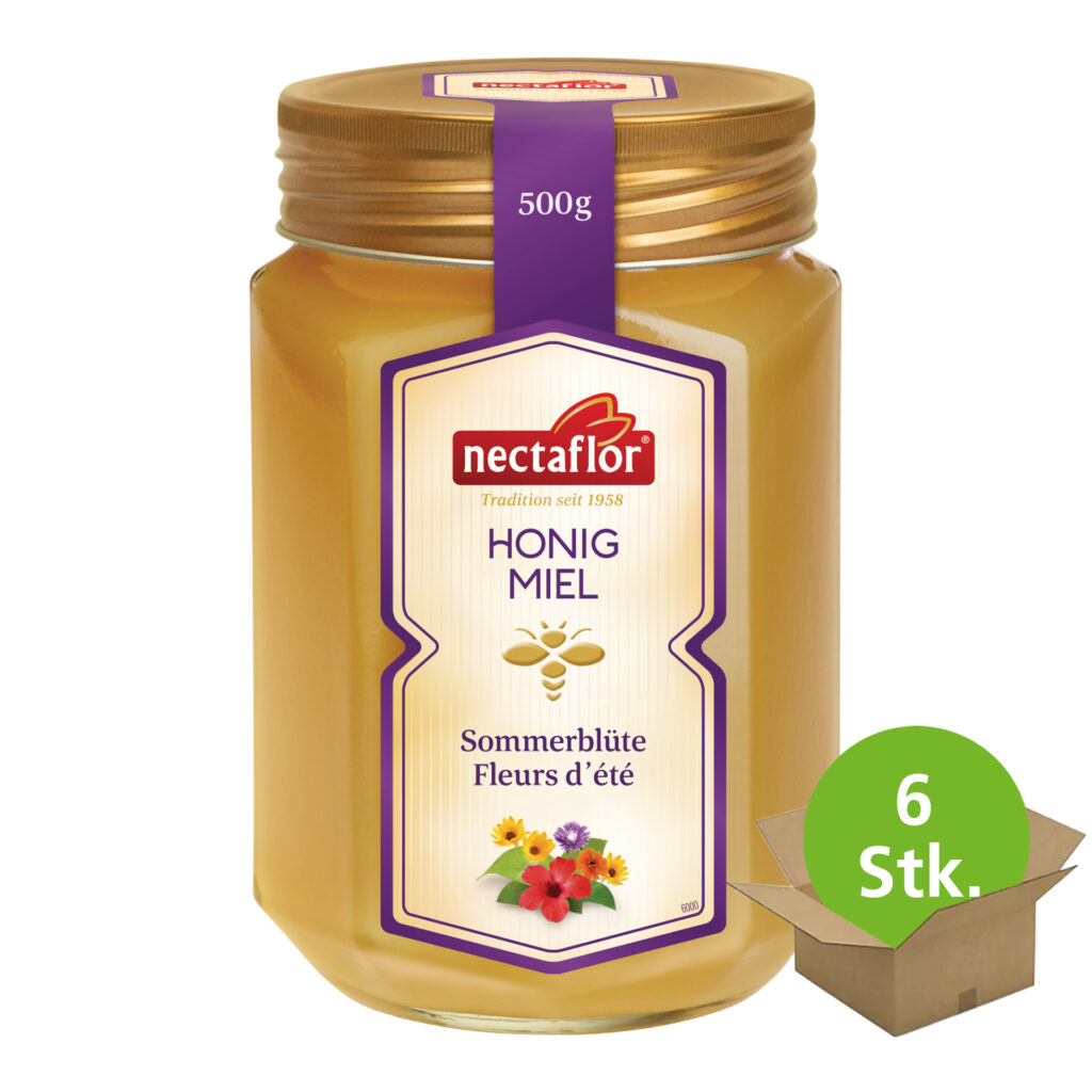 Feincremiger Honig mit mildem, lieblich-zartem Geschmack. Diesen wunderbaren Sommerblütenhonig lieben einfach alle. Lieblich-duftende Sommerblüten aus wiesenreichen Regionen in Lateinamerika und Europa verleihen dieser feincremigen Honigspezialität die goldgelbe Farbe und das zarte, milde und lieblich-feine Aroma. nectaflor Sommerblütenhonig ist eine köstliche Honigassemblage von bester Qualität und versüsst Ihnen den Start in den Tag mit einem Hauch Blütenduft. Verarbeitet in der Schweiz.