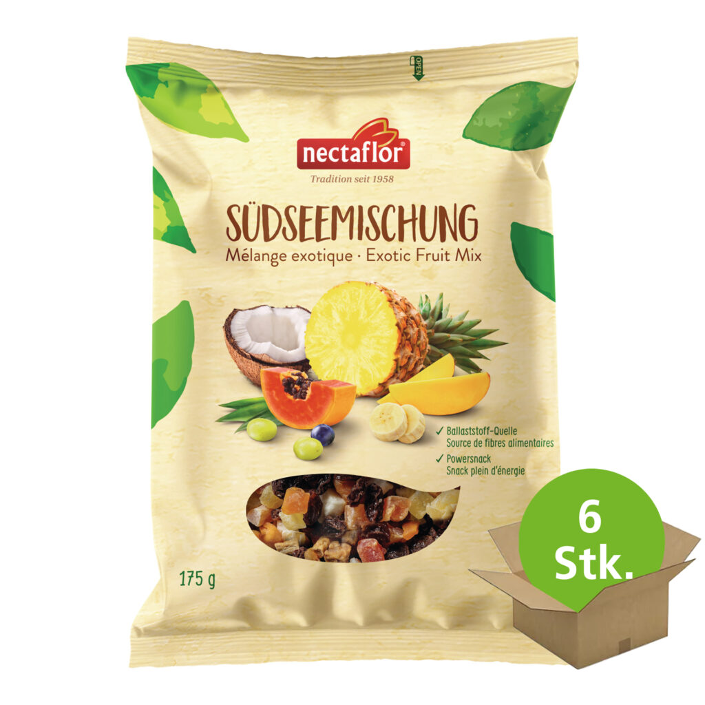 Exotik pur – mit der Südseemischung aus Kokosnuss, Banane, Mango, Ananas, Papaya und Sultaninen kommt Fernweh auf! Exotik pur – herrlich süsse Ananas-, Mango-, Papaya- und Bananen-Stückchen werden in der nectaflor Südseemischung harmonisch kombiniert mit aromatischer Kokosnuss und vollfruchtigen Sultaninen. Das erinnert an Urlaub, weckt das Fernweh und lässt die Gedanken für einen Moment in die Ferne schweifen. Diese Mischung enthält wertvolle Ballaststoffe und liefert geballte Energie und exotischen Genuss als Snack für zwischendurch.