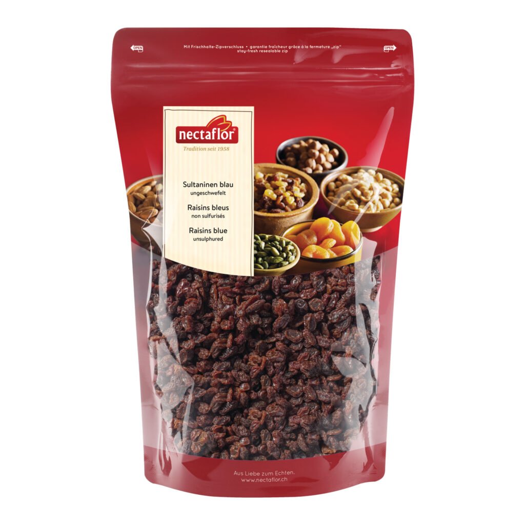 Natürlich süss und voller Energie: Sultaninen blau sind gesund und ungeschwefelt. nectaflor Sultaninen blau sind die getrockneten Beeren der sehr fruchtigen, dünnhäutigen, grossbeerigen und kernlosen Premium Qualität Sultanatraube «Thompson Seedless». Die zum Kochen und Backen aber zum gesunden Snacken geeignete Energie-Quelle ist ungeschwefelt, enthält einen hohen Gehalt an natürlichem Fruchtzucker und ist reich an Ballast- und Nährstoffen.