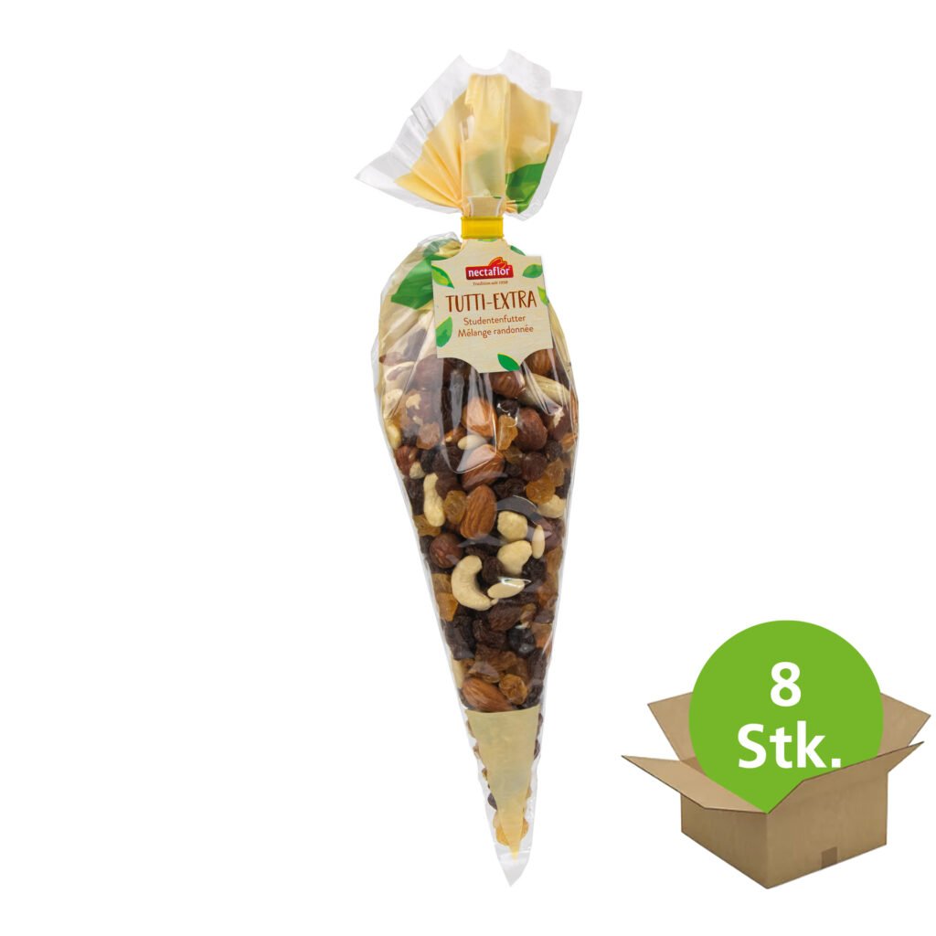 nectaflor Tutti-Extra in der beliebten Spitztüte ist der Schweizer Klassiker unter den Trockenfrucht-Nussmischungen. nectaflor Tutti-Extra ist der Klassiker unter den Klassikern. Sorgfältig ausgesuchte Mandeln, Haselnüsse, Cashews, Pinienkerne und Sultaninen verleihen dieser ausgewogenen Mischung ihren typisch nussig-fruchtigen Geschmack. Reich an hochwertigen Fetten, wichtigen Mineral- und Ballaststoffen ist der gesunde Energiespender beliebt bei Gross und Klein. Handlich verpackt in der wiederverschliessbaren und unverwechselbaren Spitztüte.